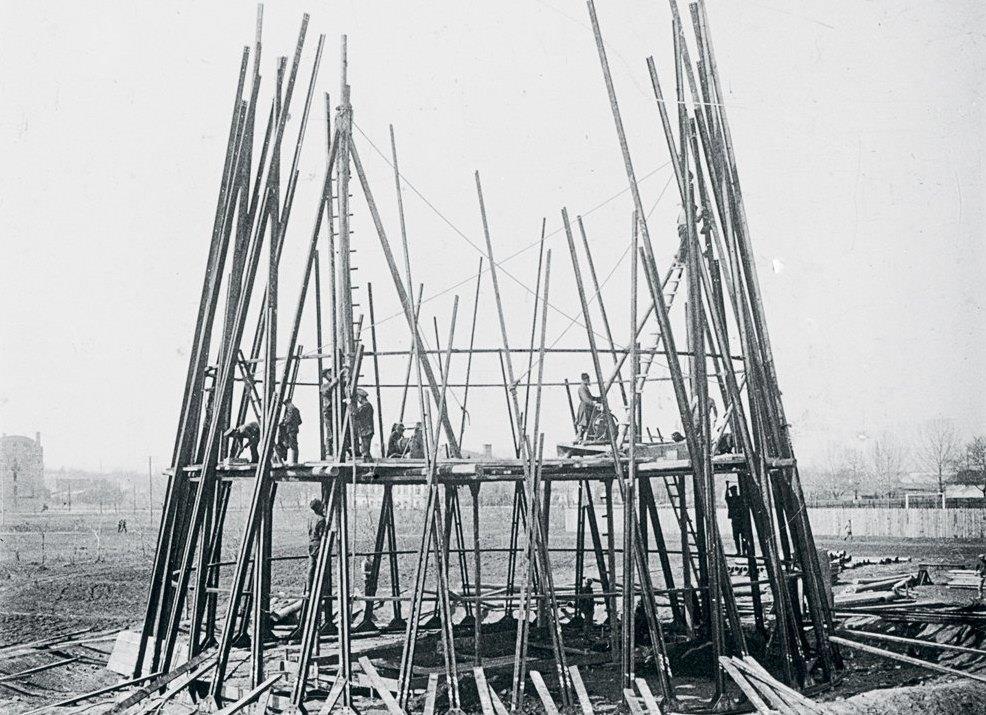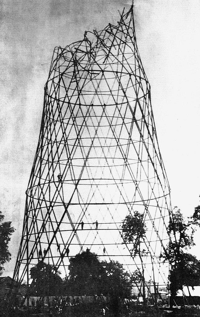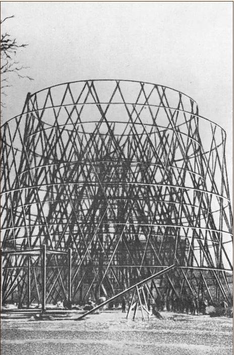 Котлован для сооружения фундамента начали рыть ещё летом 1919 года. Фундамент стали выкладывать 4 октября. Но с получением металла из резервов наркомата по военным делам вышла большая задержка. Так что монтаж секций на готовом фундаменте диаметром 40 метров и глубиной 3 метра стартовал только 14 марта 1920 года. Каждая секция, имевшая форму гиперболоида вращения, собиралась из стальных балок при помощи заклёпок.