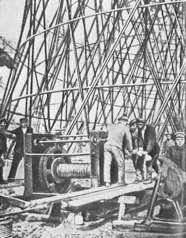 После того, как первую секцию соединили с фундаментом анкерными болтами, внутри неё начали собирать вторую. А когда вторая была готова — её подняли и состыковали с первой. Для этого использовались лебёдки.