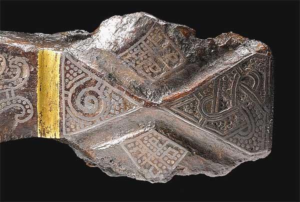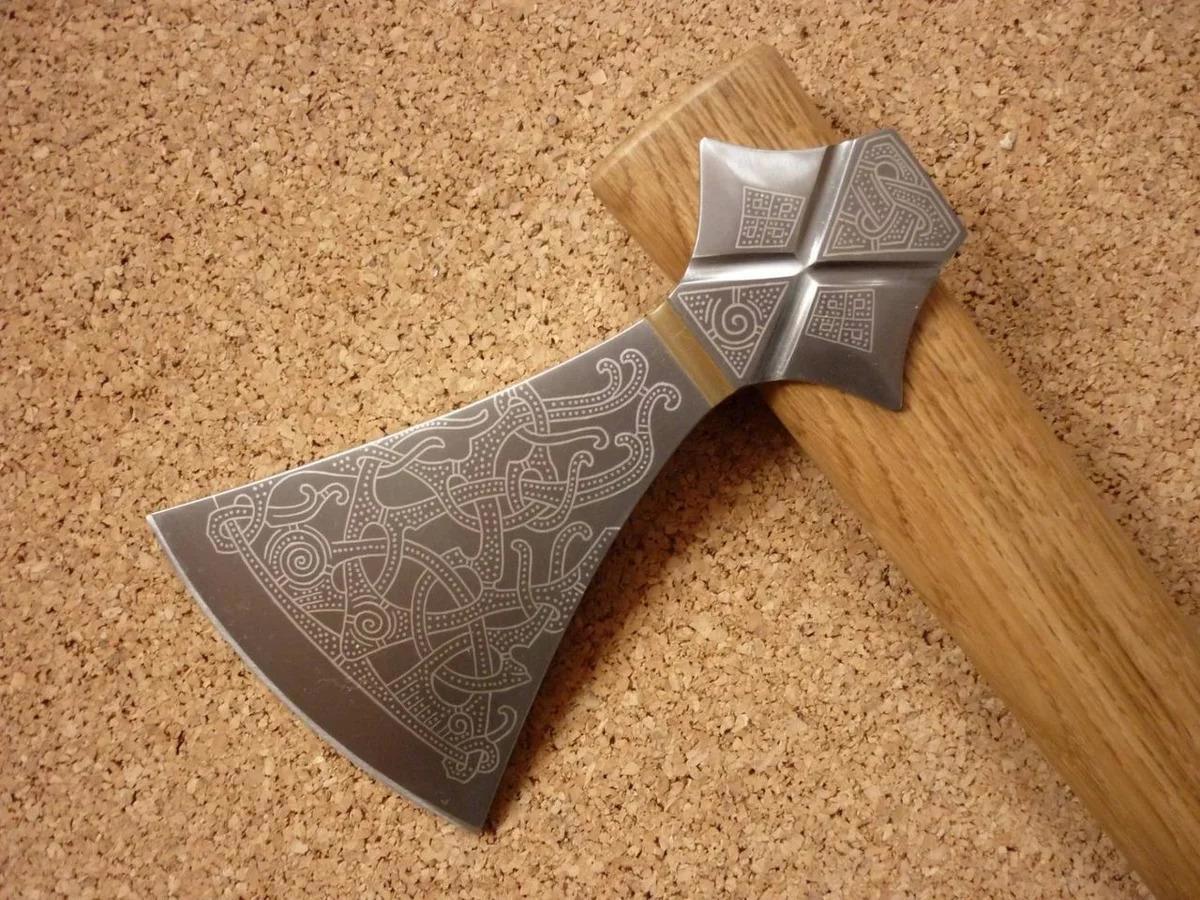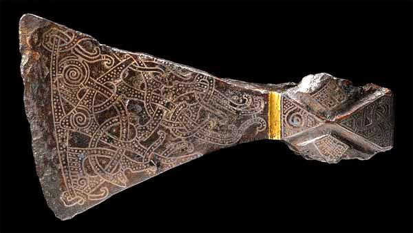 Железный топор был покрыт тонким чернёным серебряным листом, а поверх нанесён сложный орнамент, переход лезвия во втулку был покрыт золотом. Стиль отделки топора характерен для Дании 960-1020 г.г. и достаточно легко атрибутируется.