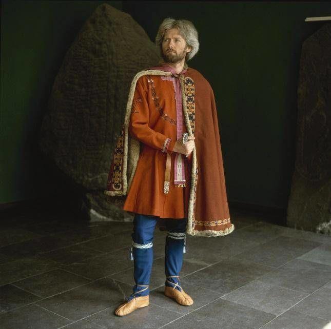 Мужчина был одет в длинные штаны синего цвета, крашеную рубаху типа туники и накидку, отделанную мехом.