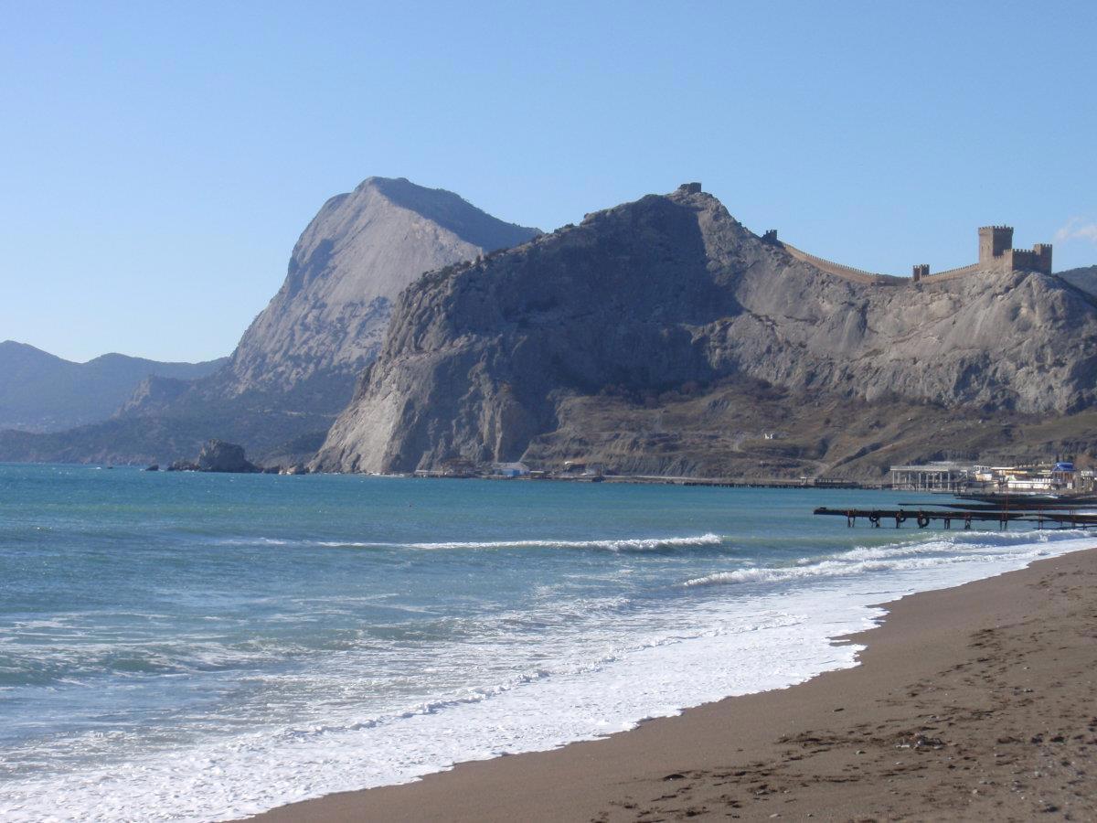 На фото ниже Сокол – это гора с чётким гребнем на втором плане, а на первом, правее – Крепостная гора, на которой расположена генуэзская крепость.