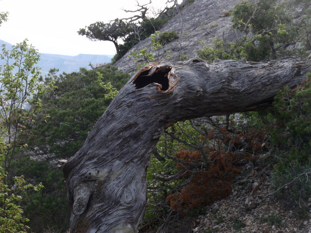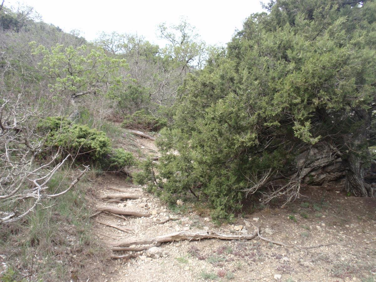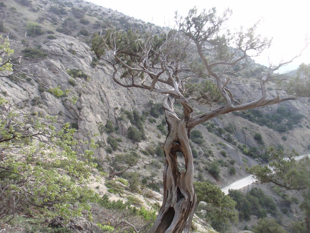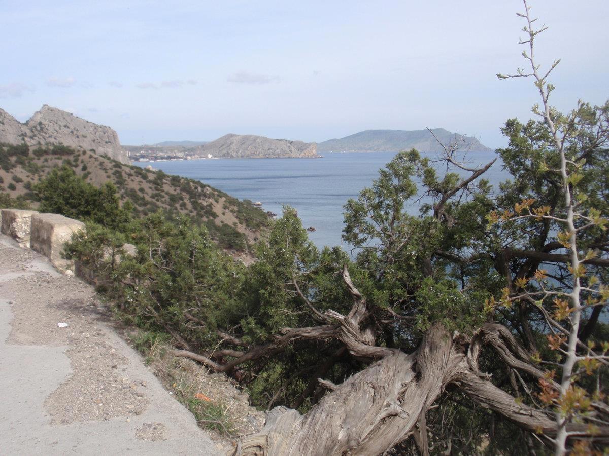 Тропа на Новый Свет тоже невероятно живописна. Воздух пахнет можжевельником – его не вдыхаешь, а просто пьёшь, как воду. Можжевельник древовидный, встречаются огромнейшие многовековые экземпляры. Много причудливо и сказочно выгнутых деревьев, прорастающих сквозь камни. Между корней бегают личинки драконов. Видели змею, но сфотать не успели ))