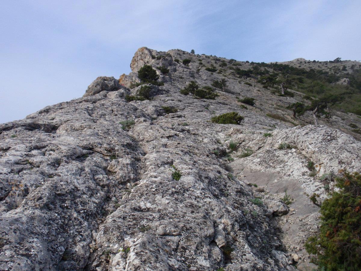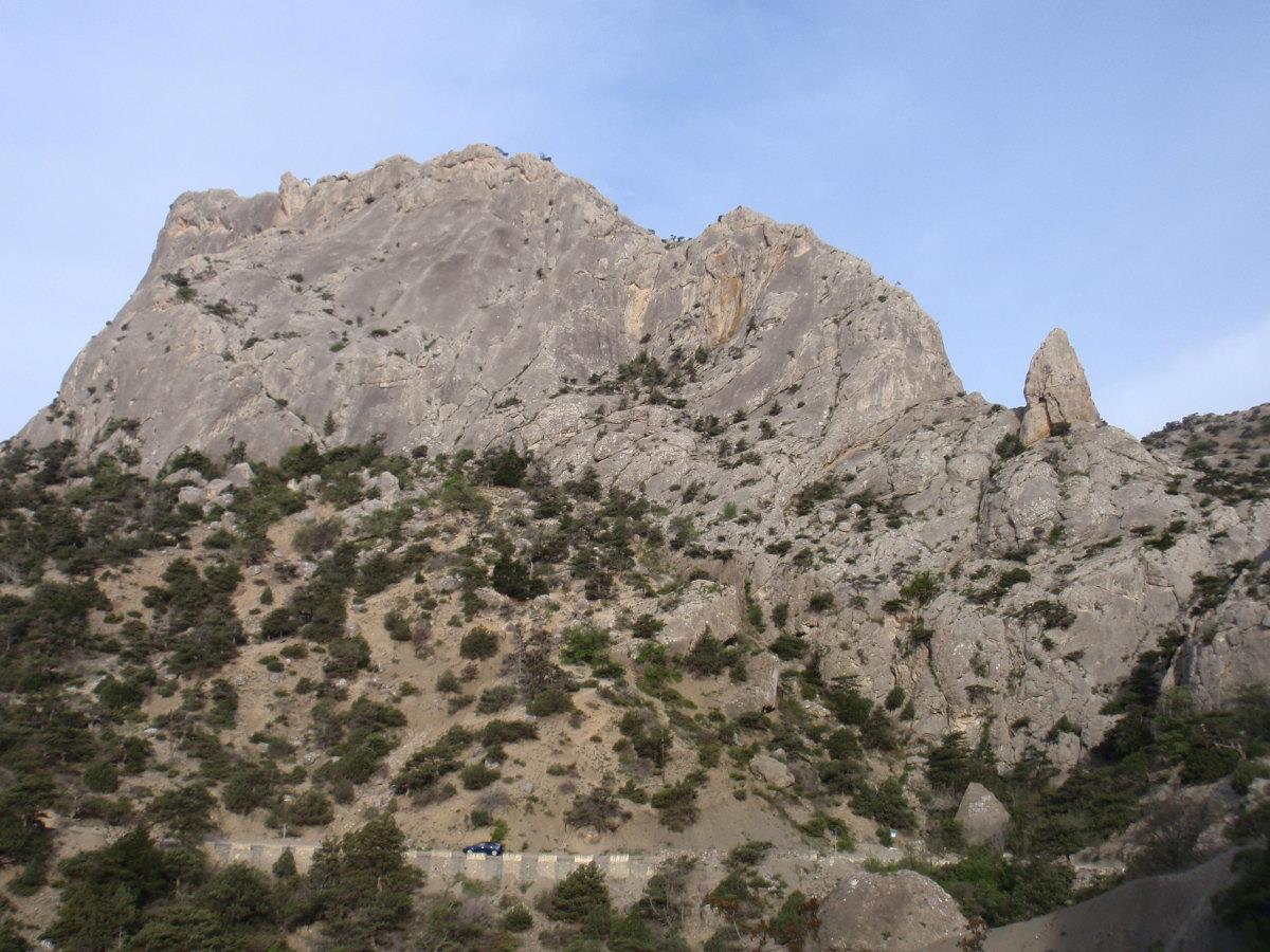 Затея была проста – подняться на Сокол со стороны Судака, мимо Чёртова пальца (отросток справа от горы) взойти на гребень, и уже по нему выйти на ведущую в Новый Свет тропу. Даже для людей с физической подготовкой ниже среднего маршрут не запредельный. Но при наличии травм спины или больных суставов лучше начинать со стороны Нового Света – тропа там пологая и подъём щадящий. Но и возвращаться тогда придётся этим же путём, потому что тропы со стороны Судака капризны, каменисты и местами круты. Подниматься по ним – куда ни шло, а спускаться хуже. Поэтому мы разделились. Часть пошла через Чёртов палец, часть – через Новый Свет.