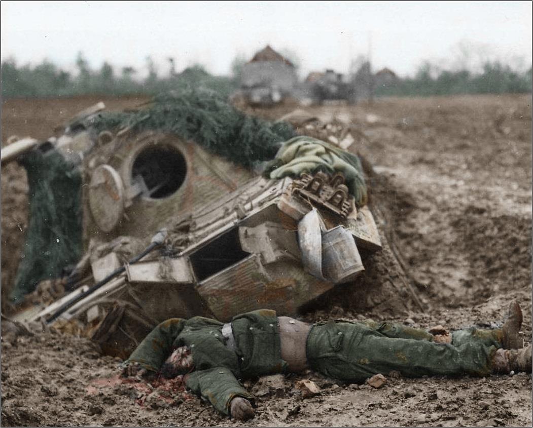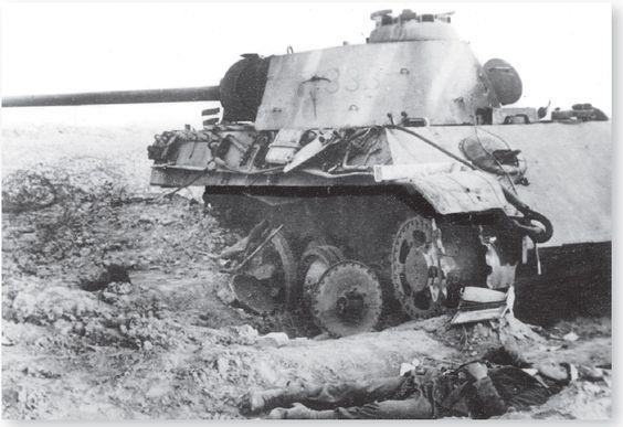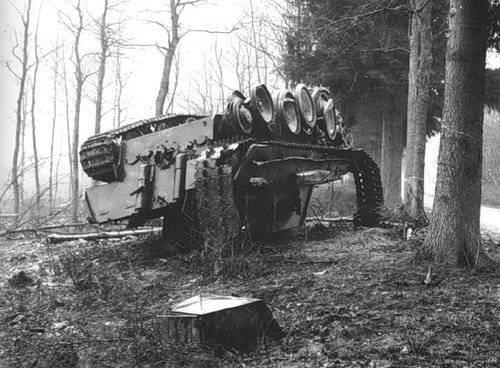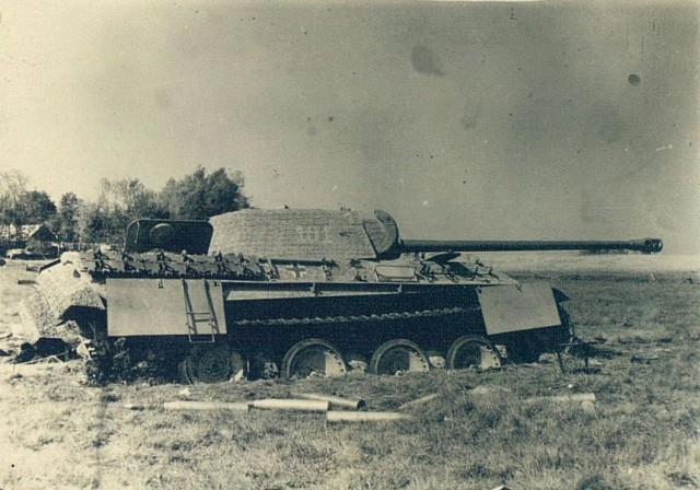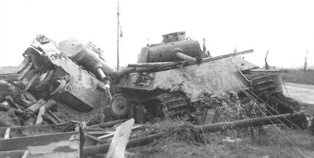 Бомбежка была, Пантера кувыркнулась. (Так-то похоже на фугас больше - но это Бельгия, контратаковавшая группа нарвалась на ответ, потому не уверен, чтотам ставили фугасы, а вот бомбили преисправно))
