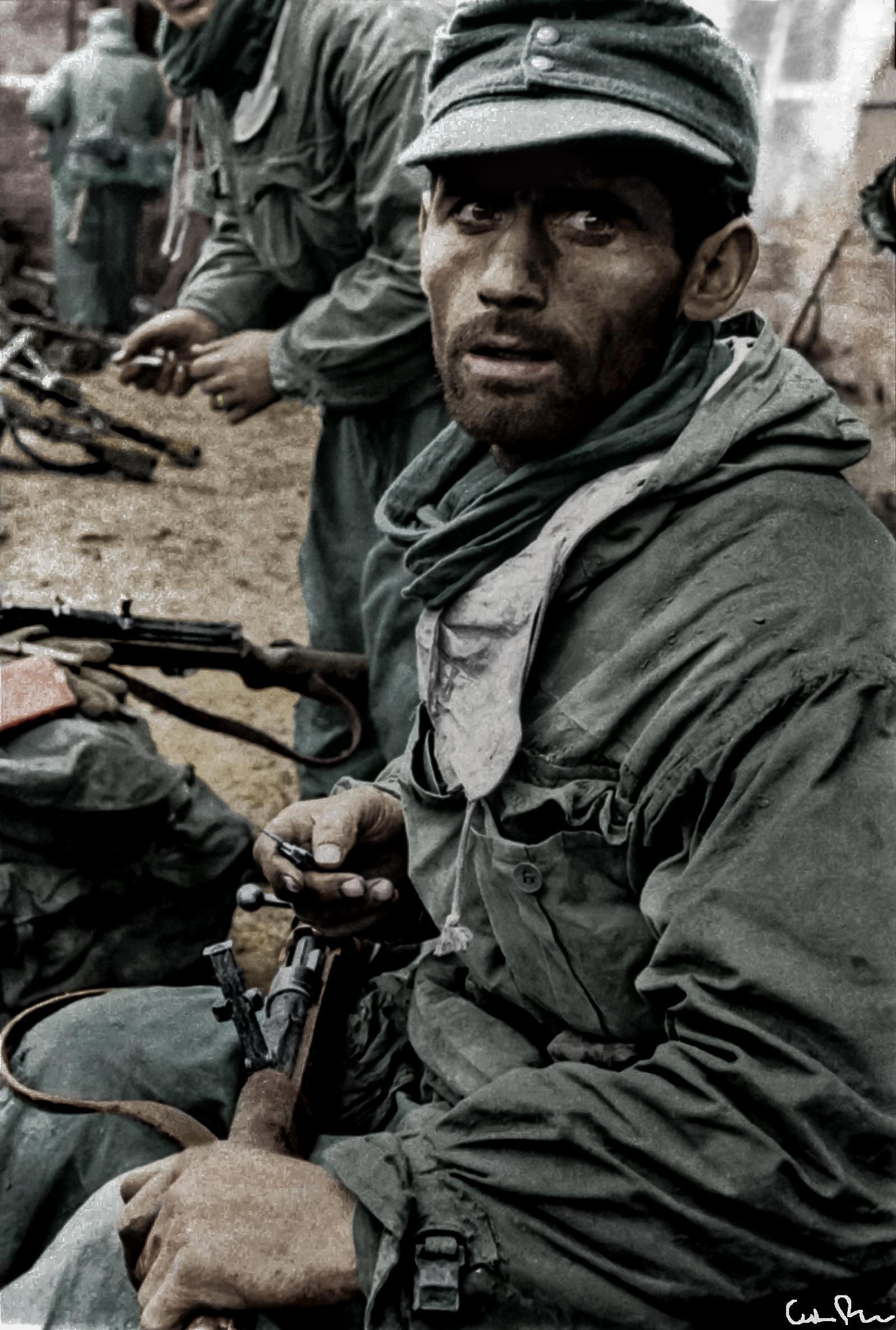 Нашивки за уничтоженные в "рукопашном бою" танки на правом рукаве кителя. Вообще матерый немец, богато награжденный. При этом в форме Рабочей имперской службы - аналог нашего Осоавиахима - Досааф. Хотя эта организация воевала исправно с оружием в руках - этот скорее списан из армии по состоянию здоровья.