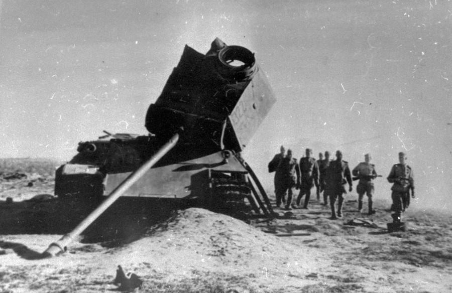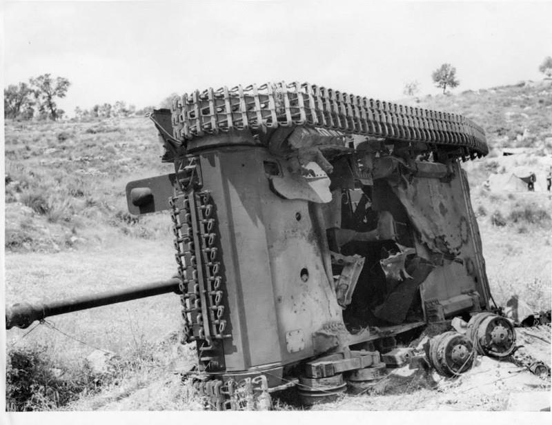 Сгоревшая кошка. Мне кажется - толком окопаться не успели, а снаряды получили сзади - полагаю обошли фрицев. Башню ответно развернуть не успели.