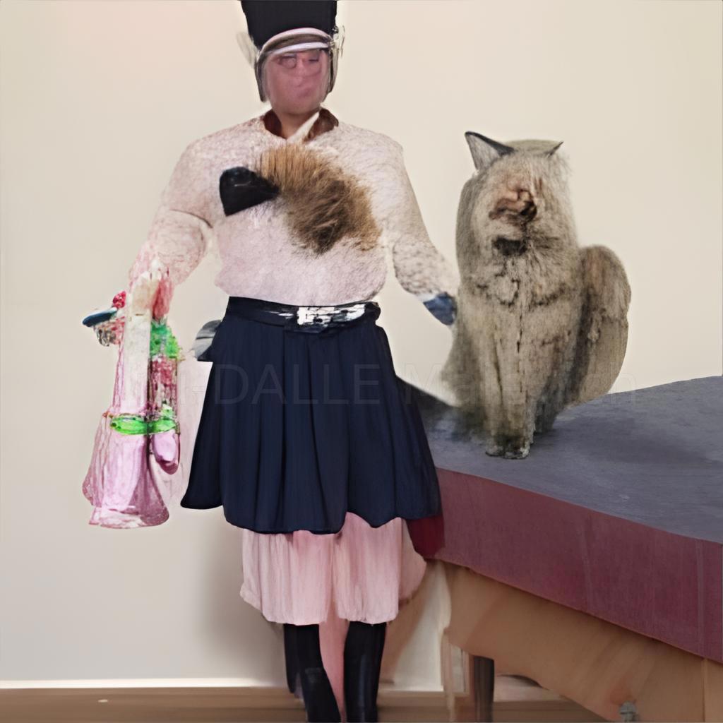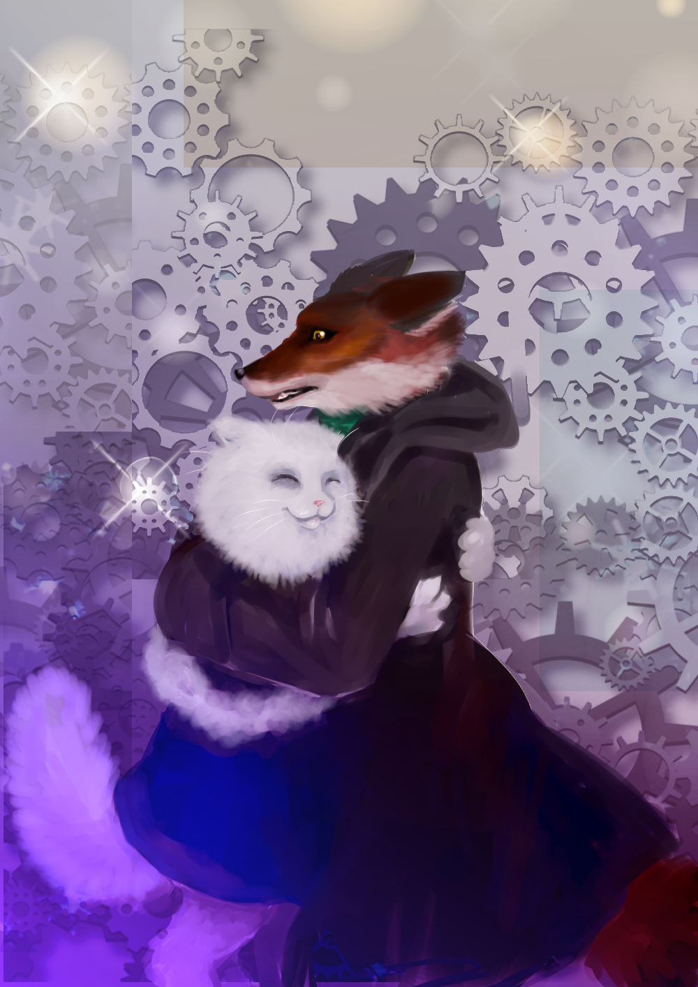 Лис стоит на двух лапах в костюме викторианской эпохи с тростью в лапе. Рядом с лисом стоит на задних лапах белая пушистая кошка с голубыми глазами. На кошке надето синее однотонное платье, на плечах у кошки чёрная накидка с оборкой из белого меха. Шея кошки обмотана бирюзовой шалью.