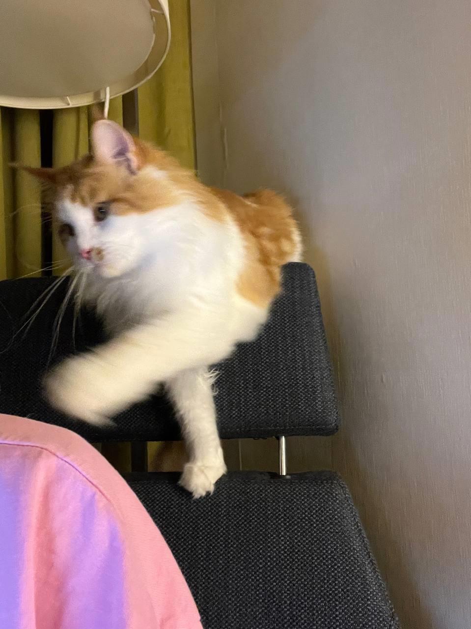 Дама вообще не любит, когда некто располагается на её месте. Поэтому она карабкается по спинке кресла на самый вверх и оттуда отстаивает свои права лапами.