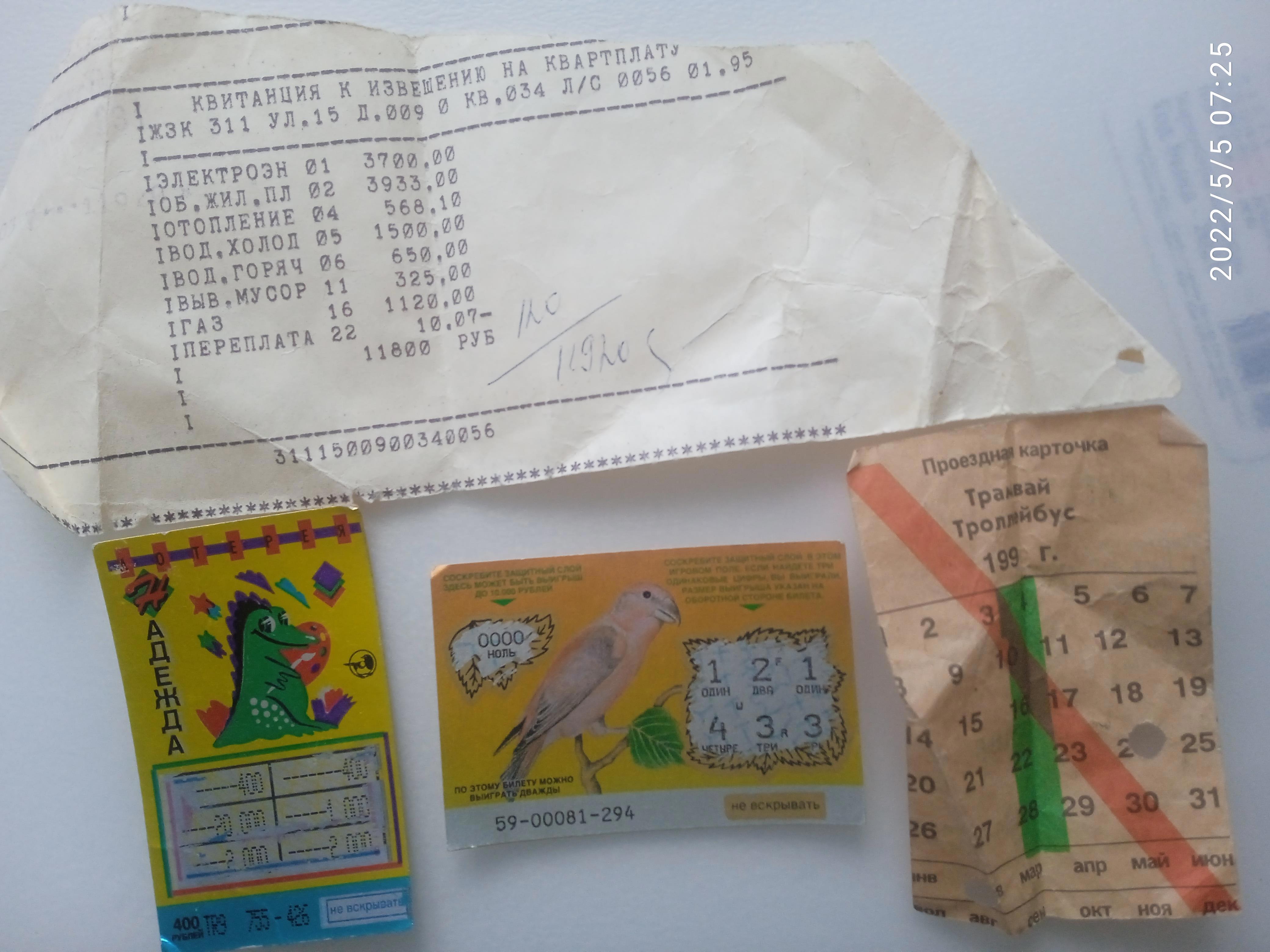 Квиток за ЖКХ в январе 95-го, билет на трамвай на 24 января (2000 стоил такой одноразовый) и карточки мгновенной лотереи, дико популярные в то время.
