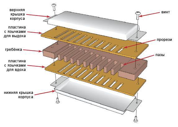 На гребенке помещаются металлические пластины с язычками, которые, собственно, и нужны нам для того, чтобы издавать душещипательные звуки. Они крепятся с помощью болтов или гвоздей – все зависит от модели ГГ. Верхняя пластина для игры на выдох, нижняя – на вдох. В пластинах имеется 10 прямоугольных прорезей, поверх которых с помощью заклепок крепятся язычки (медные или стальные). Главное, чтобы между краями прорезей и язычками имелся зазор, иначе звука не будет.