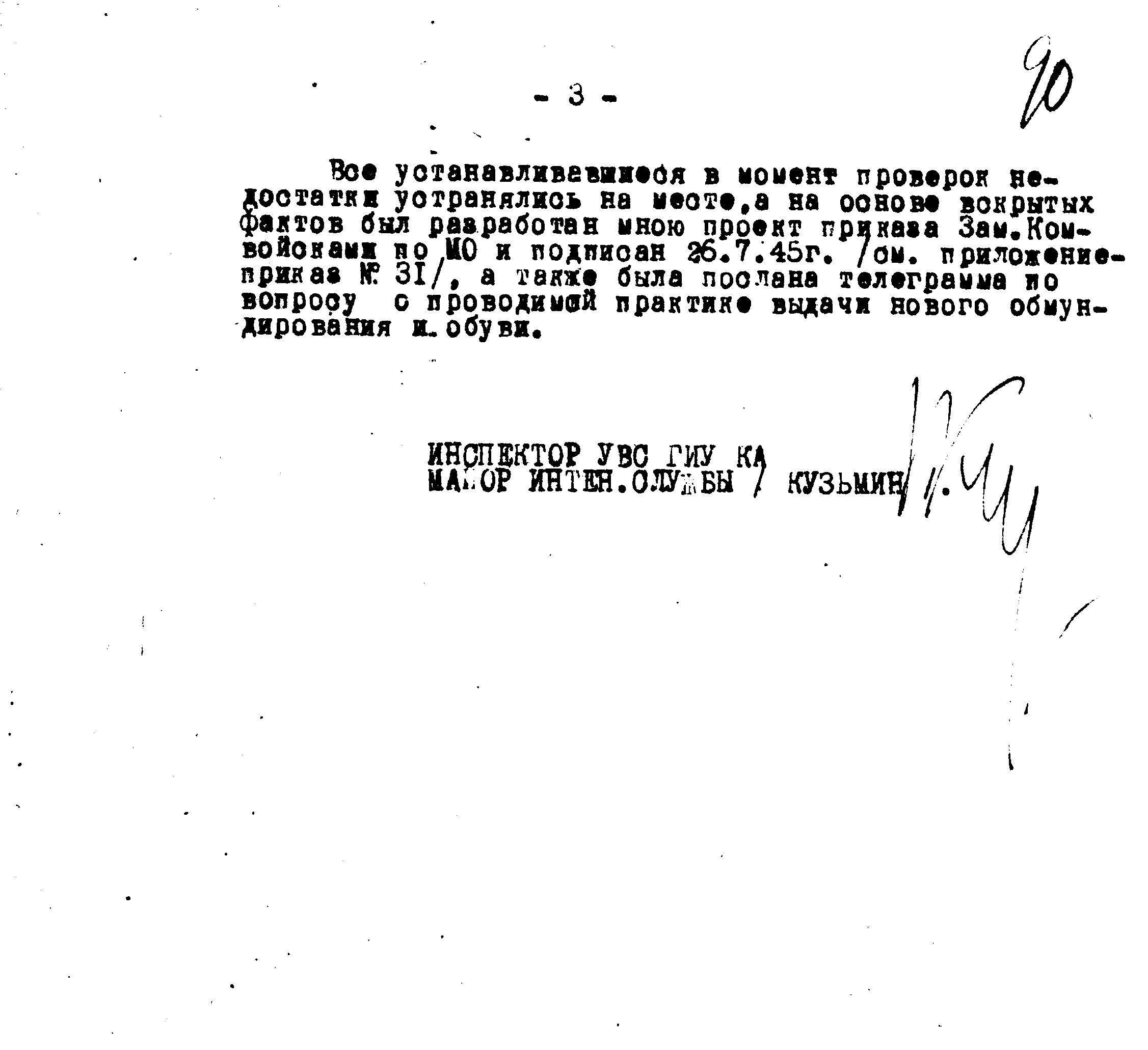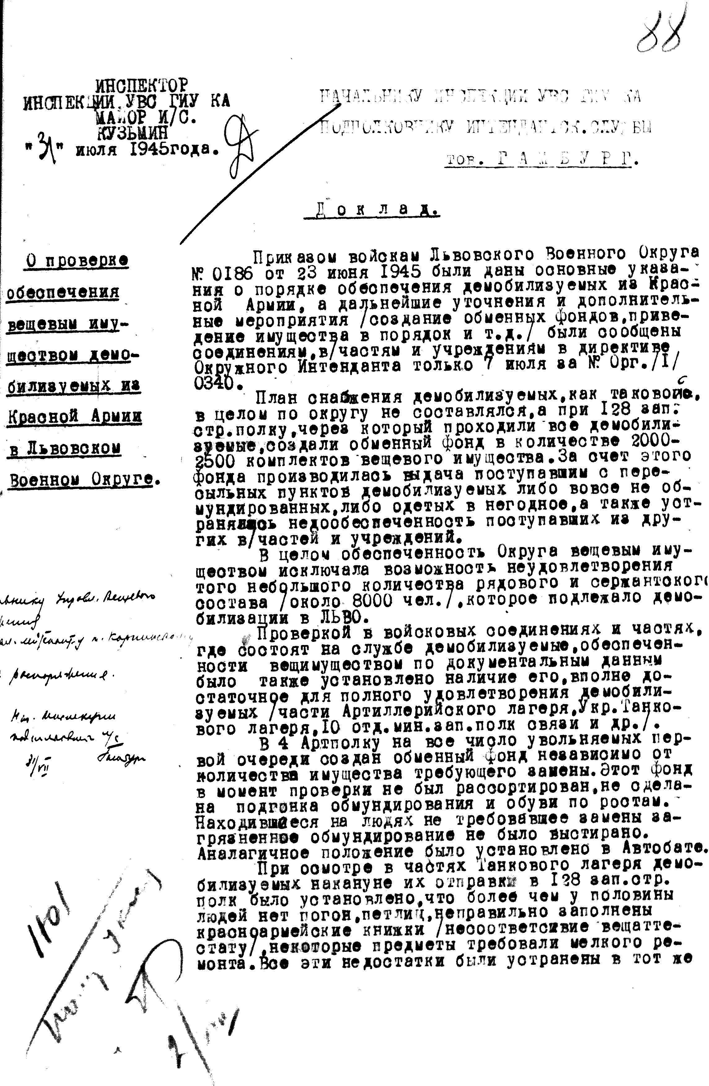д/с: Доклад инспектора Управления вещевого снабжения майора и/с Кузьмина