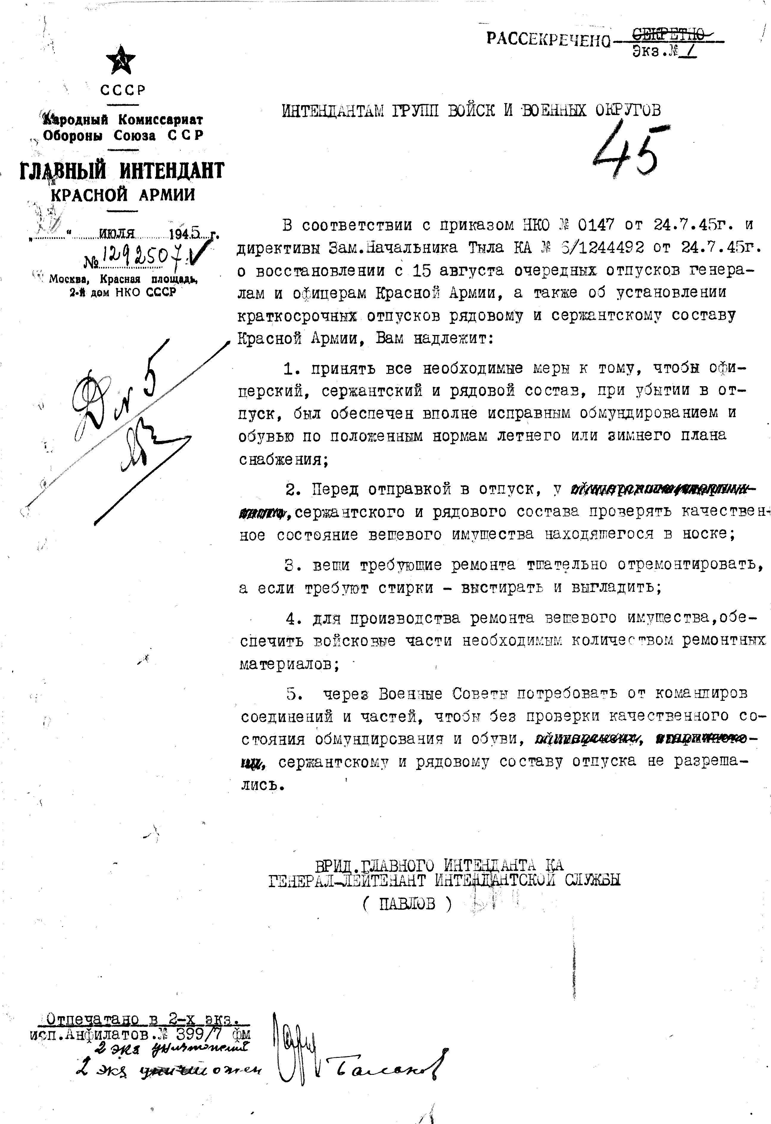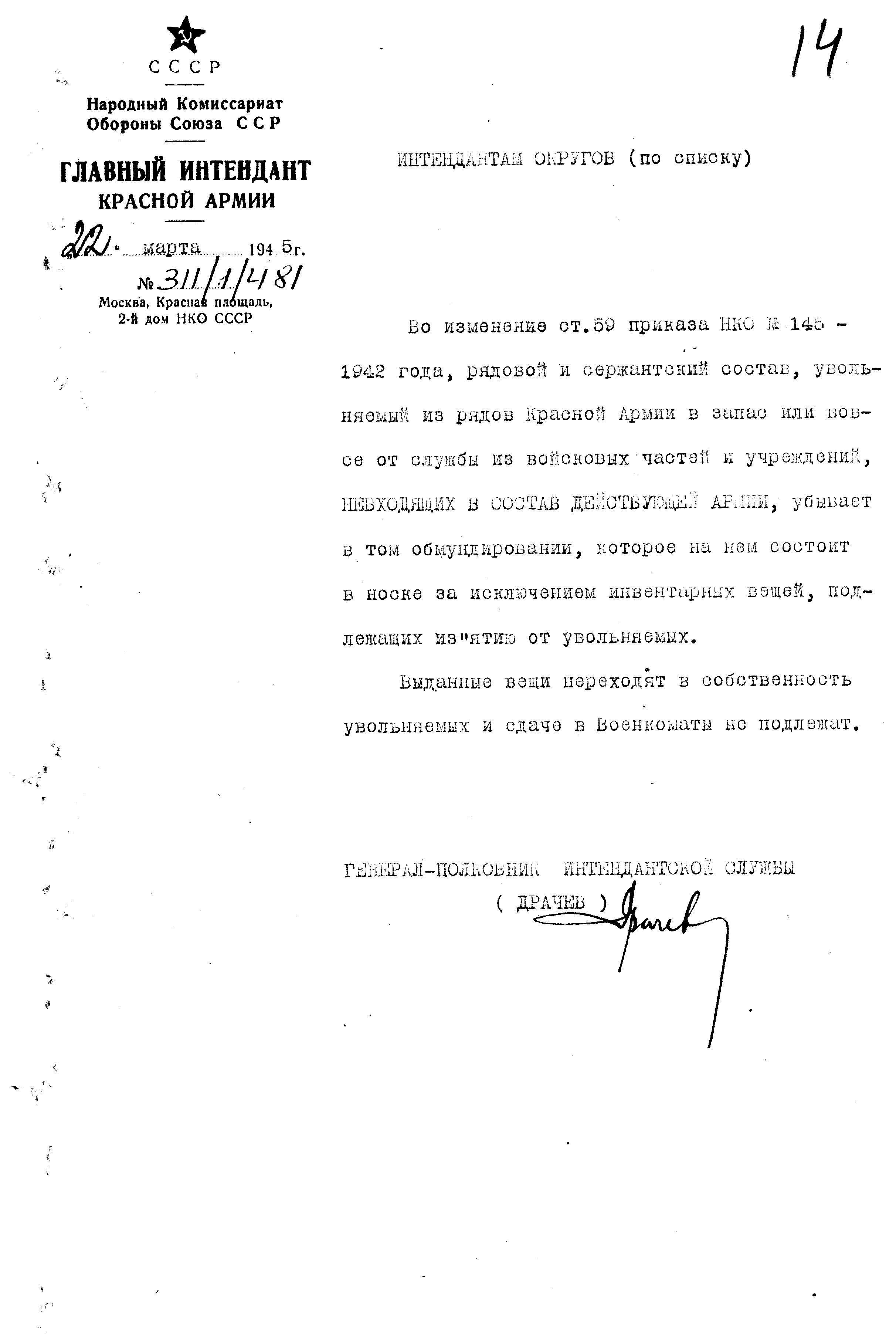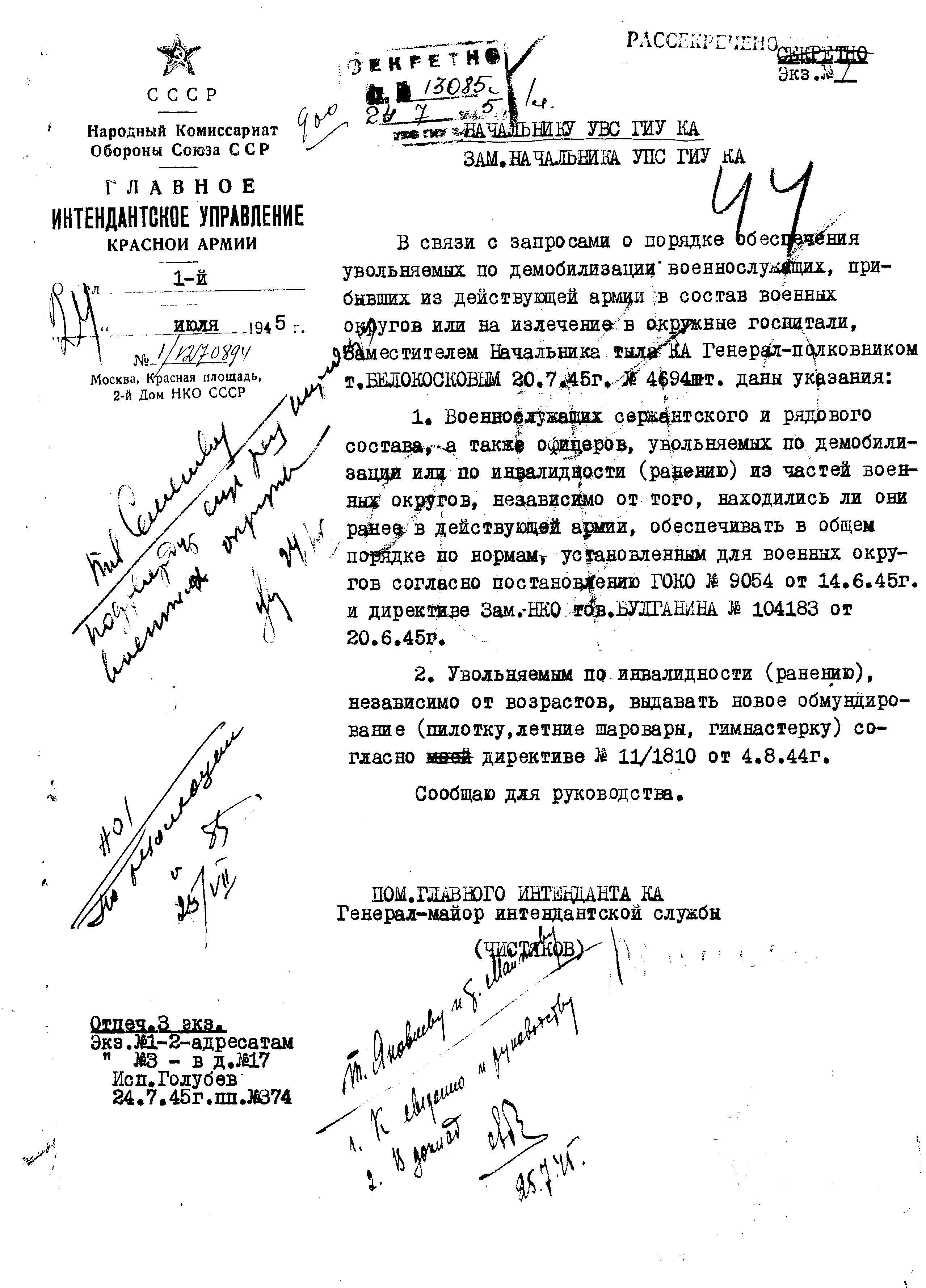 д/с: Указание Главного Интенданта Красной Армии по вещевому обеспечению увольняемых по демобилизации военнослужащих, прибывших из действующей армии в состав военных округов или лечение![]()