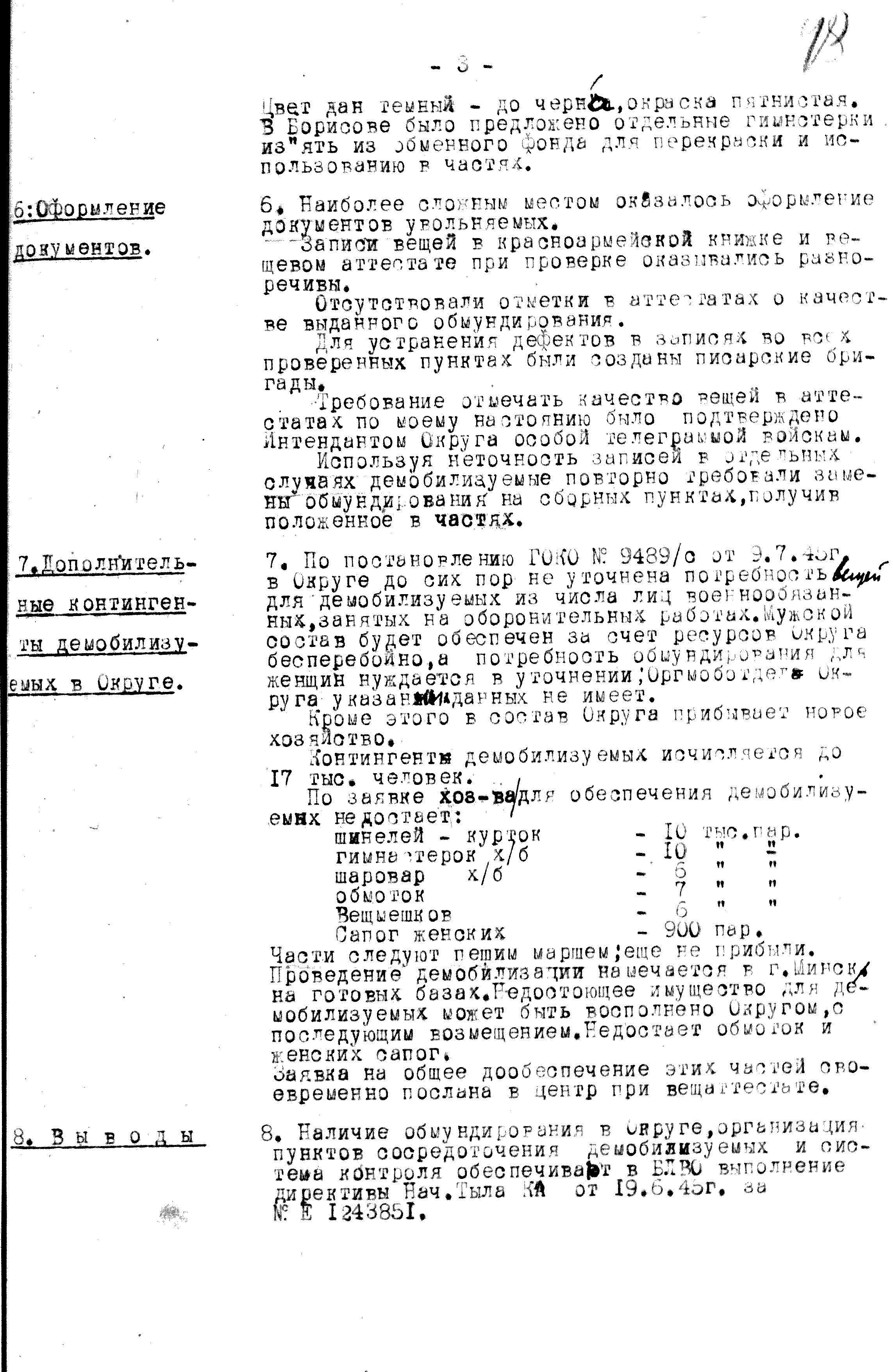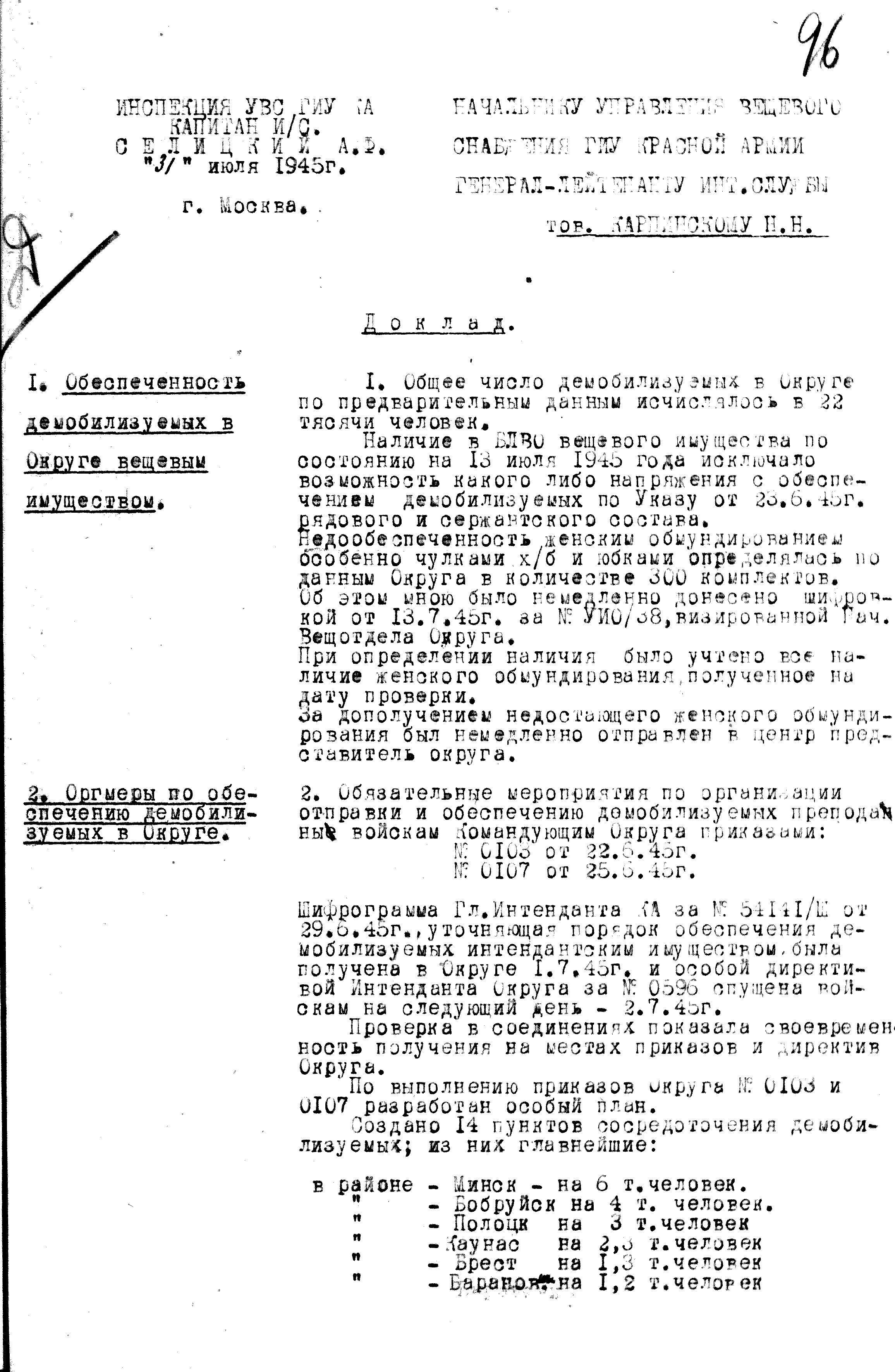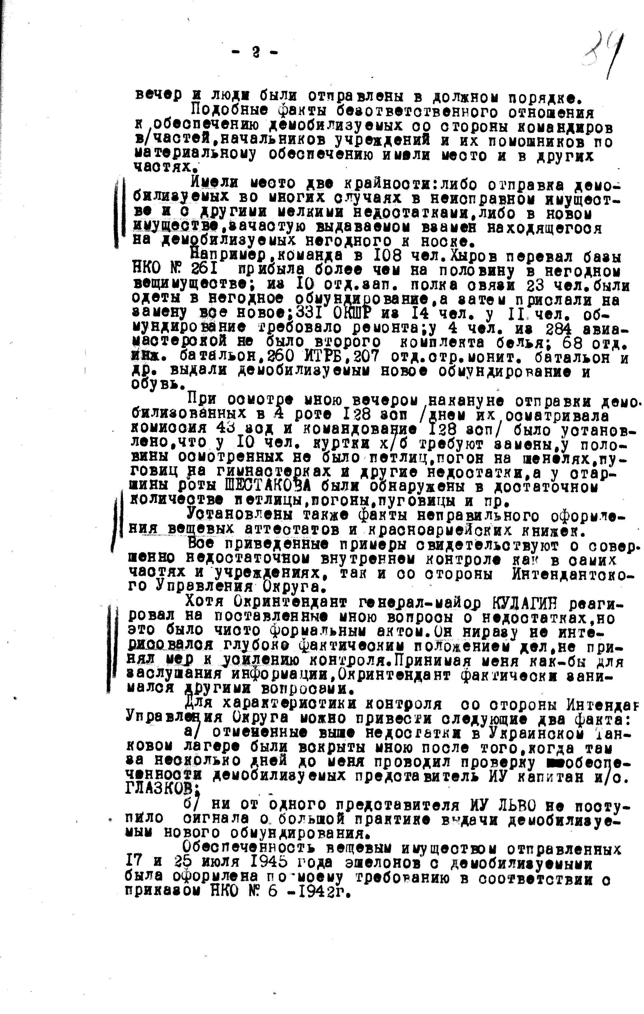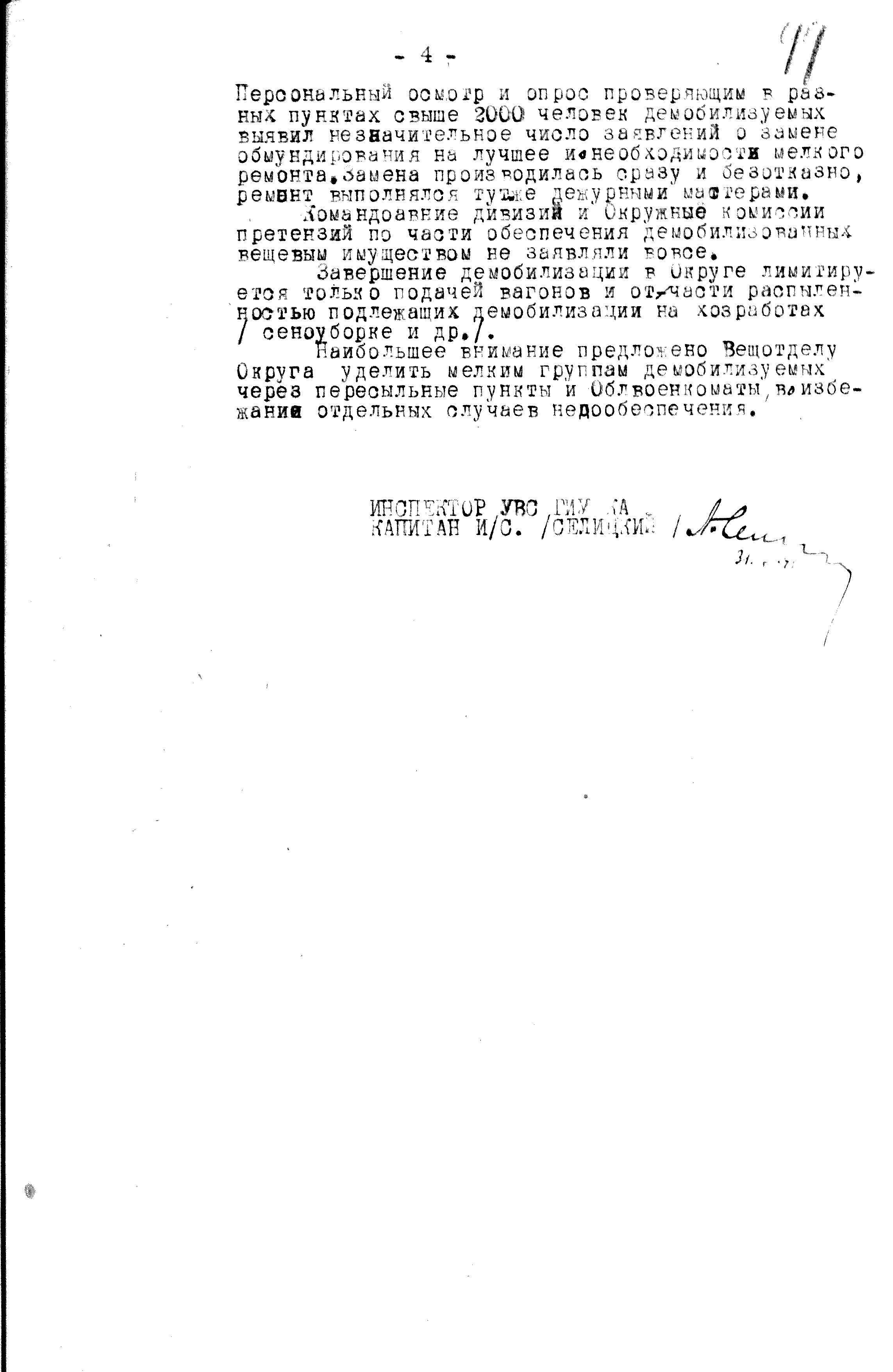 Для проверки обеспеченности демобилизуемых военнослужащих продовольствием и вещевым имуществом, Главное Интендантское Управление направило своих представителей, на все фронта (кроме, конечно, Дальневосточного и Забайкальского) и приграничные военные округа. Всё же какими бы подробными ни были различные руководящие документы, контроль за подобными мероприятиями должен быть.