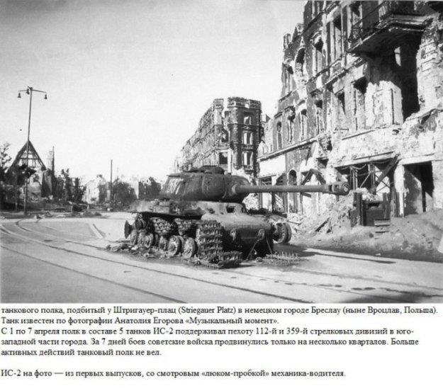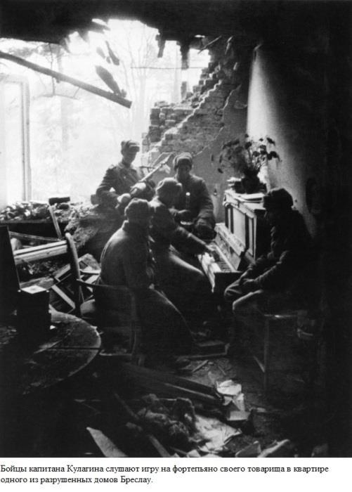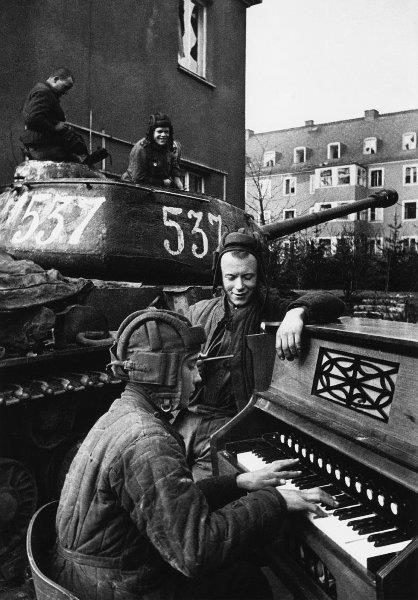 Танковый экипаж гвардии лейтенанта Б.И. Дегтярева на отдыхе. Башенный стрелок Б.В. Калякин играет классическую музыку своему экипажу, рядом с ним стоит механик-водитель А. И. Козейкин. 1-й Украинский фронт, 87-й гвардейский тяжелый танковый полк, Бреслау. 27 апреля 1945 года. Война почти закончилась.