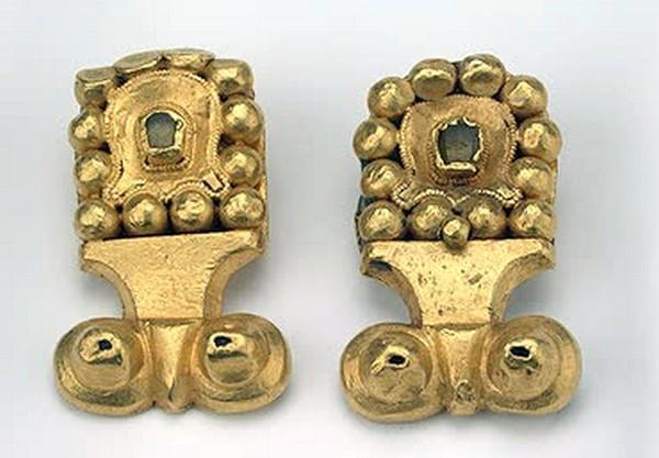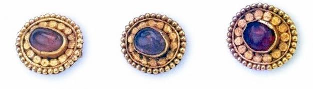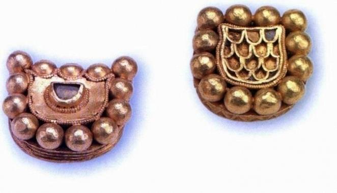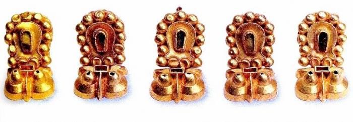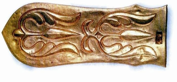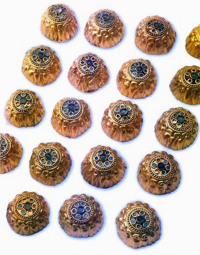 А на ремнях конской сбруи надёжно закрепили вот эти золотые бляшки с камнями: