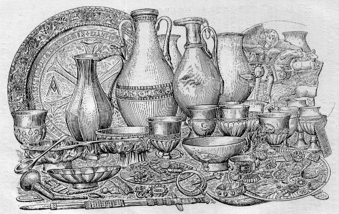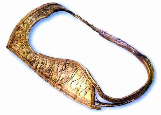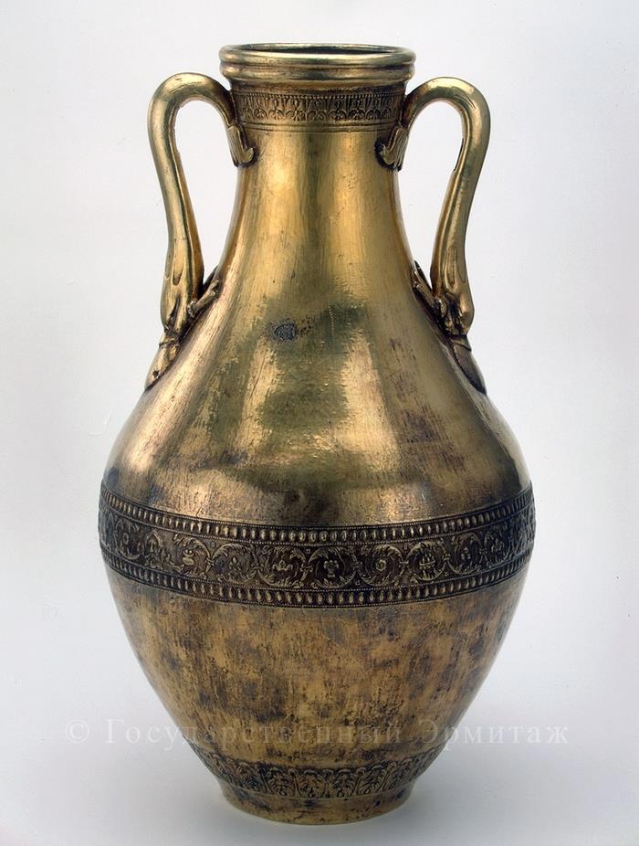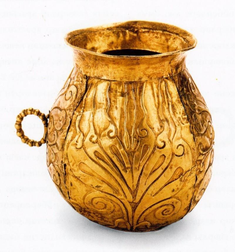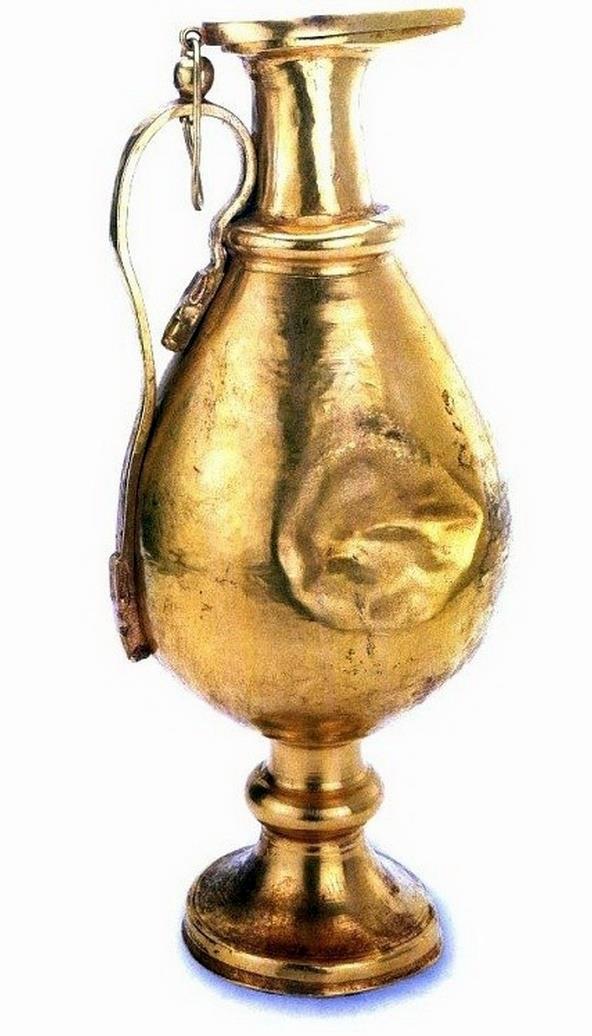 Кое-какие фотки изделий из клада я накопал в интернете. География рождения изделий очень широка, что может означать о хороших торговых связях хана с соседями ближними и дальними. Первой нужно показать конечно «ту самую» амфору. Такой тяжёлой золотой амфоры больше в мире нет. Напомню – 8 кг золота. Вот так выглядит этот шедевр: