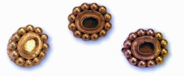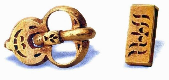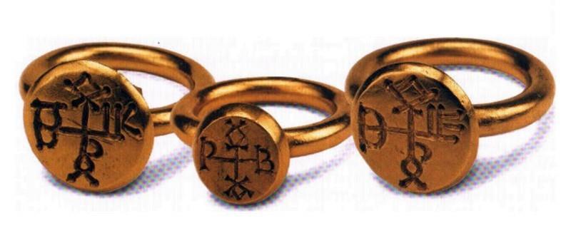 В списке находок имеются также перстни с камнями, фотографий которых я не нашёл. Но вот три перстенёчка более простого вида, но более интересные. Дело в том, что это перстни-печатки. Все три сделаны в Византии. В центре перстень с монограммой самого Кубрата. Справа перстень «Кубрата патрикия»... так написано в каталоге, но что сиё означает – не знаю. Третий перстень принадлежал дяде Кубрата, которого звали Орган. Почему они оказались в могиле племянника не ясно. К тому же чужие перстни явно крупнее ханского. Получается, что главным был совсем не Кубрат? В общем смотрите и думайте сами. Тут интересно то, что перстни до такой степени похожи, что выглядят как «типовые» изделия. Такие, какие мог выдавать император своим верным слугам, которые руководили провинциями. В общем это ещё раз навевает подозрения о подчинённой роли хана Кубрата по отношению к Византийскому «старшему брату»:
