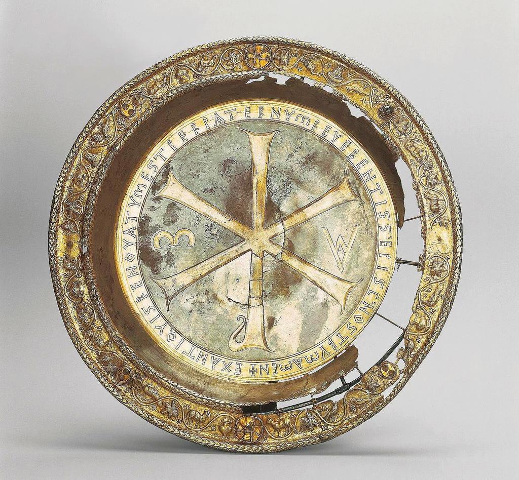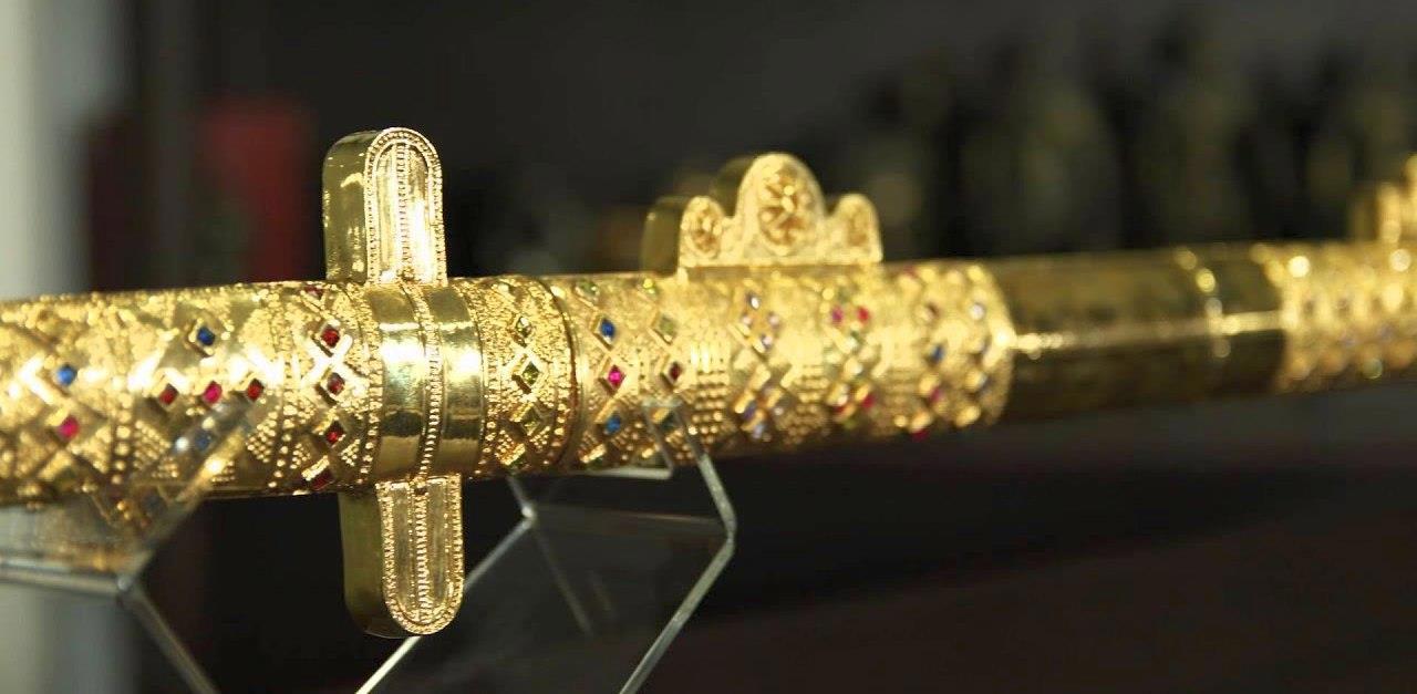 Стальной меч длиной в 942 мм с золотой рукоятью и золотыми ножнами, который по преданиям хан Кубрат получил в подарок от Византийского Императора. В этой связи хочется уточнить – Кубрат считался «другом» Византийского императора. Очень интересный факт, если учесть, что в политике друзей и родственников не бывает вообще-то. Получается, что Великая Болгария была не такая уж и великая, а была просто сателлитом Византии. Хочу обратить ваше внимание на рукоять. Такая форма характерна для куда более ранних скифских мечей... к чему бы это?