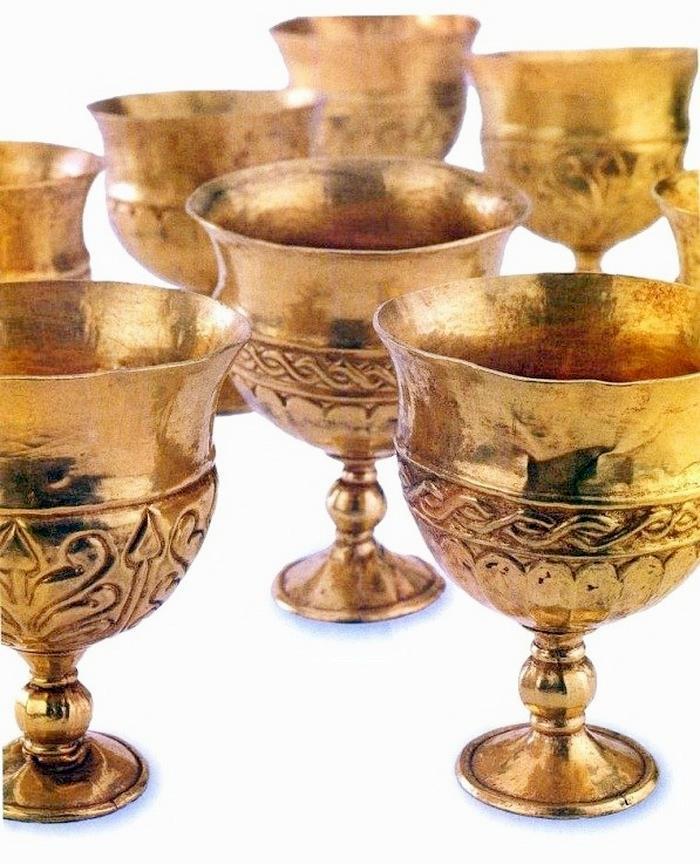 Золотые кубки. Интересно, что хотя размер у них одинаковый, но оформлены они всё же по-разному, так что возможно, что их делали в разное время или в разных местах, а только потом собрали в сервиз: