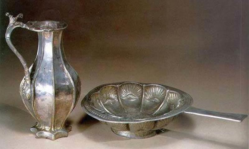 Набор из кувшина и блюда предназначенный для умывания. Всё из серебра:
