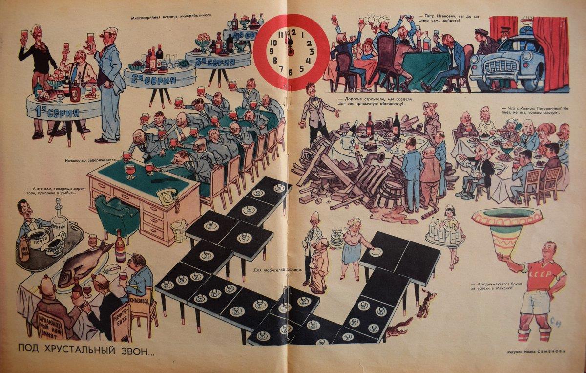 Вполне под понятие виммельбух подходят некоторые иллюстрации старых выпусков журнала «Крокодил». Случайно пробежалась по статьям прошлого века (в поисках идей, как водится). Конечно, журнал не для детей (по сути). Иллюстрации совсем не яркие, но детали! Есть вполне достойно прорисованные, отражены события, сюжеты, явления…