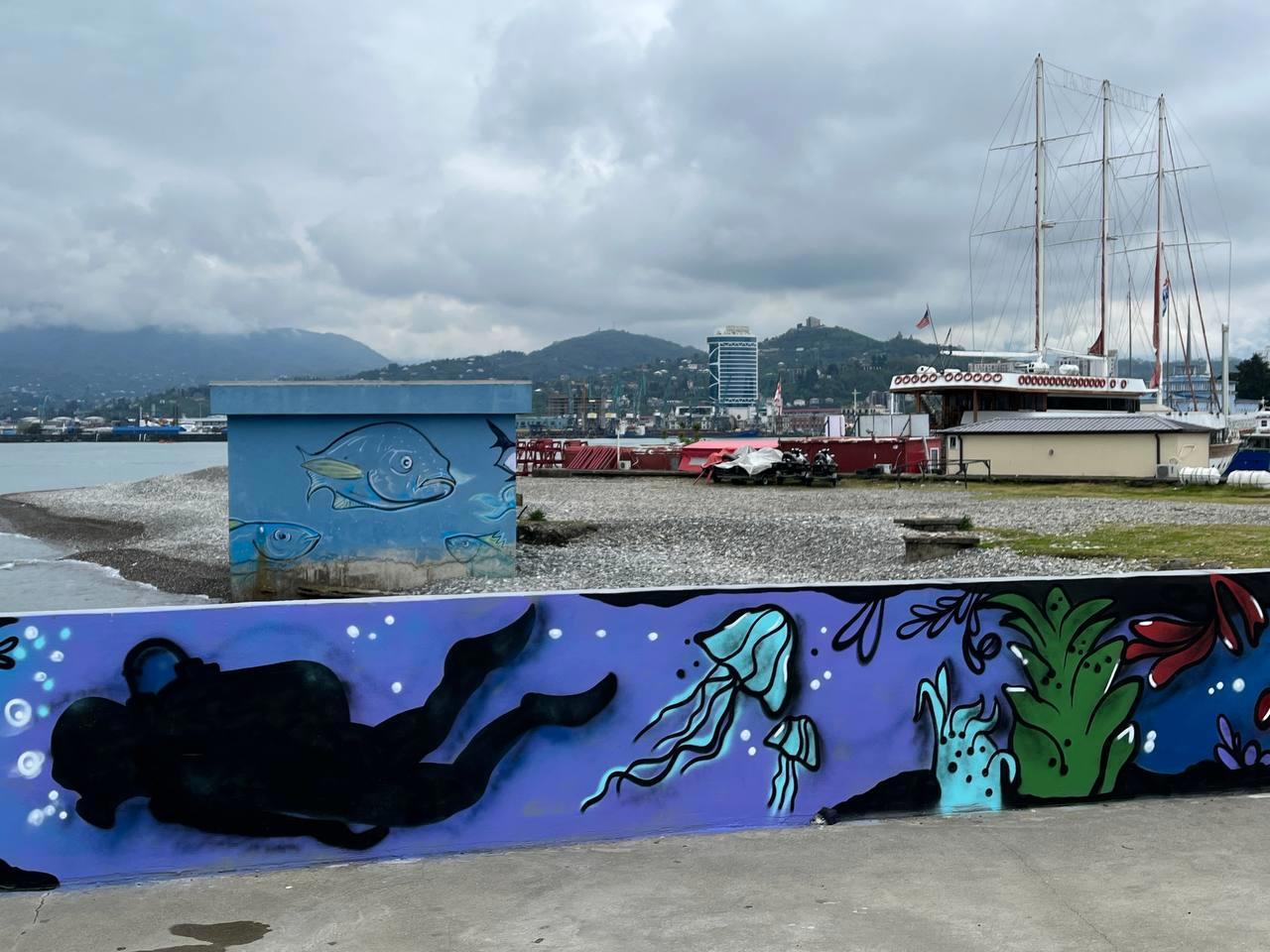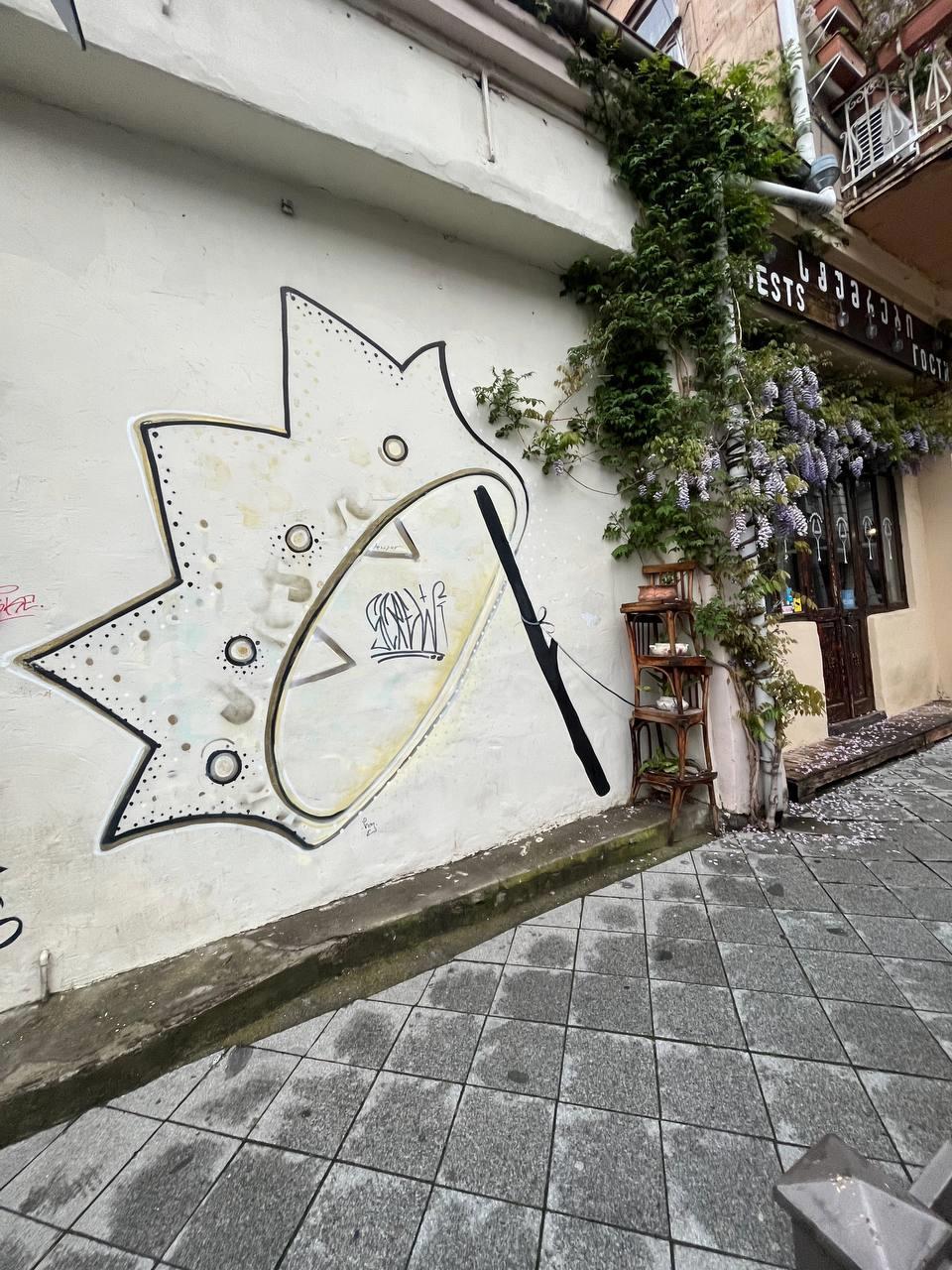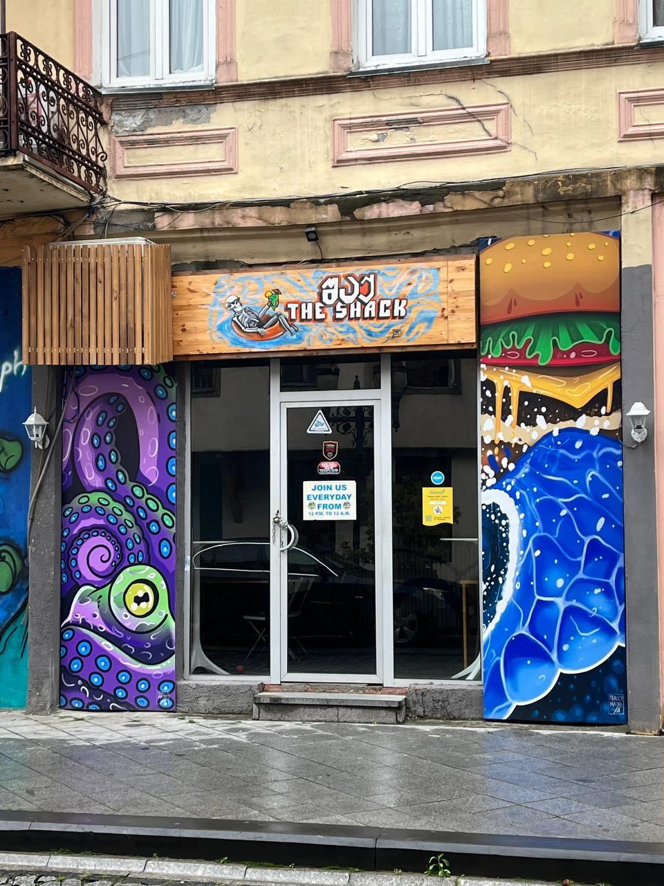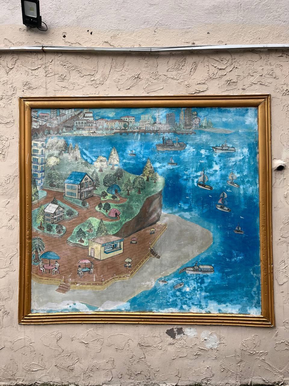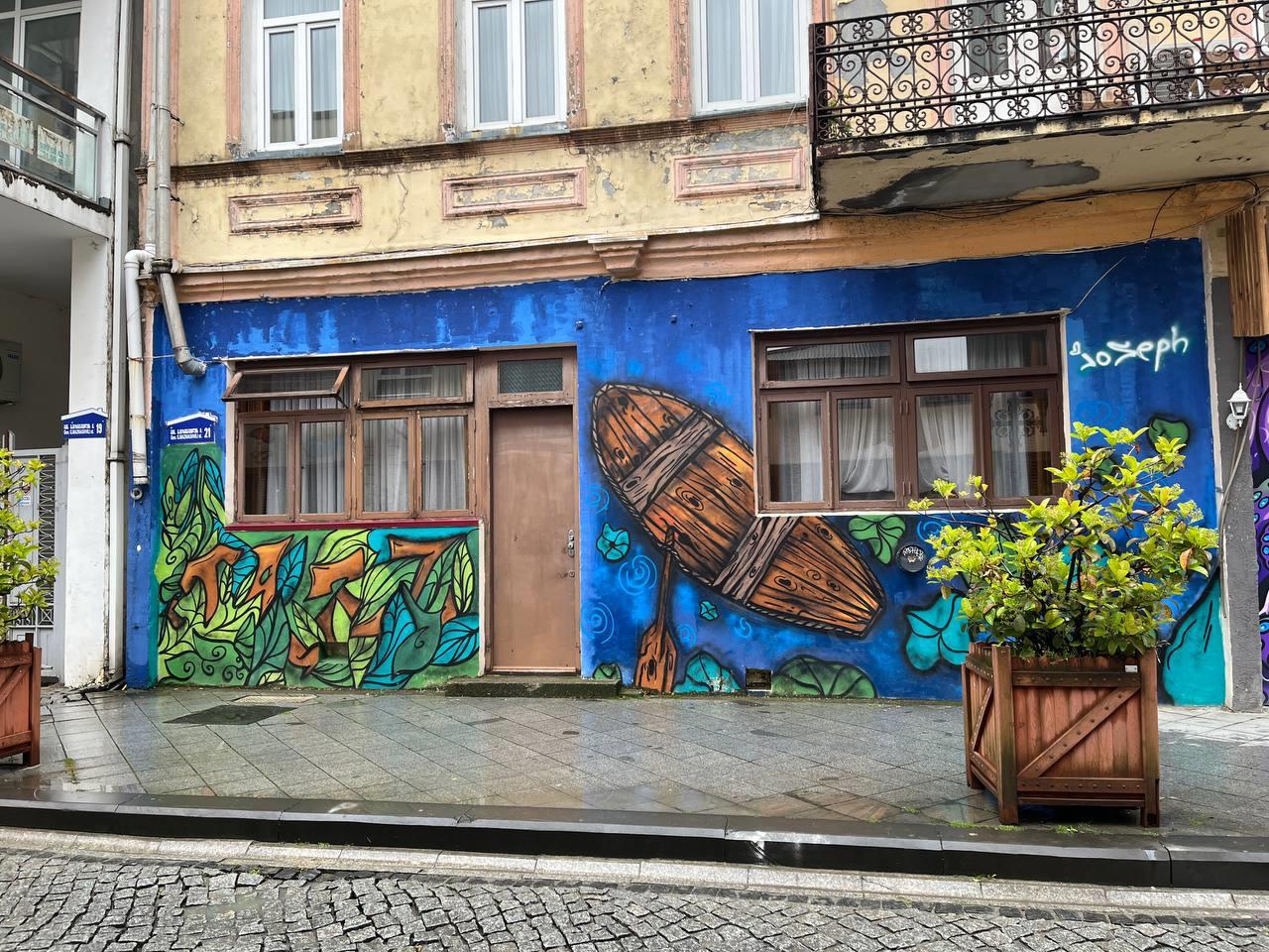 В Батуми очень многие заведения, чтобы заявить о себе, используют не плакаты и вывески, а именно арты на стене здания. В прошлом блоге уже был пример такого бара :)
