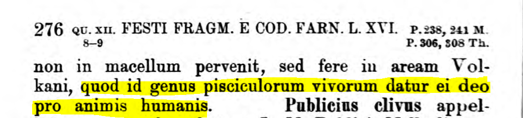 Есть версия, что рыбу, пойманную во время Ludi Piscatorii, запекали на Вулканале, а потом, отдав положенную часть Вулкану, её забирали победители состязаний. Но высказываются также соображения, что в древности на Вулканале приносились человеческие жервоприношения. По крайней мере, Фридрих фон Дун предполагал, что там сжигались человеческие тела. А позже человеческие жертвоприношения были заменены сжиганием живой рыбы или мелких животных в ходе вулканалий, отмечавшихся ежегодно 23 августа, и улова от Ludi Piscatorii 7 июня. Живая рыба на алтаре заменяла человеческие души ("quod id genus pisciculorum vivorum datur ei deo pro animis humanis"), как писал об этом в книге "О значении слов" Секст Помпей Фест.