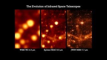 Although Spitzer (launched 2003) was earlier than WISE (launched 2009), it had a larger mirror and a narrower field-of-view. Even the very first JWST image at comparable wavelengths, shown alongside them, can resolve the same features in the same region to an unprecedented precision. This is a preview of the science we'll get.