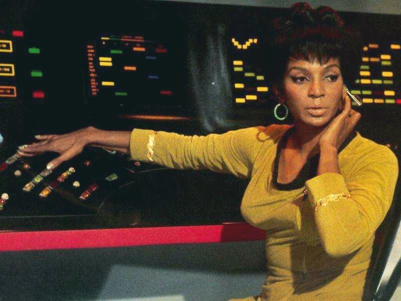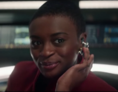 Девочка - молодец! Она потрудилась точно скопировать жест первой Ухуры из сериала 1966 года, где та стала чуть ли не первой чёрной актрисой на телеэкране! Да, немного жеманно, как тогда было принято. Но всё-таки она производит приятное впечатление, как и оригинал.