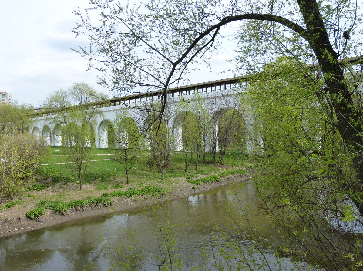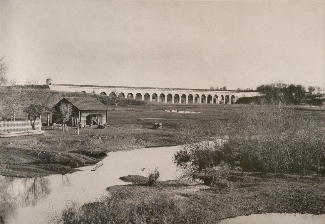 Воду впервые пустили 28 октября 1804 года. Она была чистой и хорошей на вкус. Но общий объём приходящей воды оказался ниже, чем предполагалось. Из 330 тысяч вёдер воды, поступавших в водовод из мытищенских ключей, до Москвы доходило едва 40 тысяч вёдер. Это объяснялось тем, что поток воды очень быстро размыл кирпичные водоводы и просачивался сквозь швы и трещины в кладке. А на подземных участках ключевая мытищенская вода смешивалась с грунтовой. Так что уже в 1826 — 1835 годах Мытищенскому водопроводу потребовалась первая реконструкция, в 1853 — 1858 годах — вторая, а в 1890 — 1892 года — третья. Но это уже совсем другая история. Отмечу только, что Ростокинский акведук в XIX веке ремонтировать не пришлось — его построили очень качественно и надёжно. Только в 1902 году его укрепили, чтобы несущие конструкции могли выдерживать чугунные трубы для воды. В последнее десятилетие XIX века акведук выглядел так: