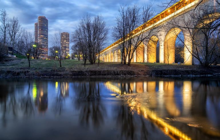 В вечернее время Ростокинский акведук красиво смотрится с подсветкой (это фото не моё).