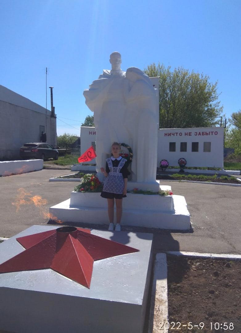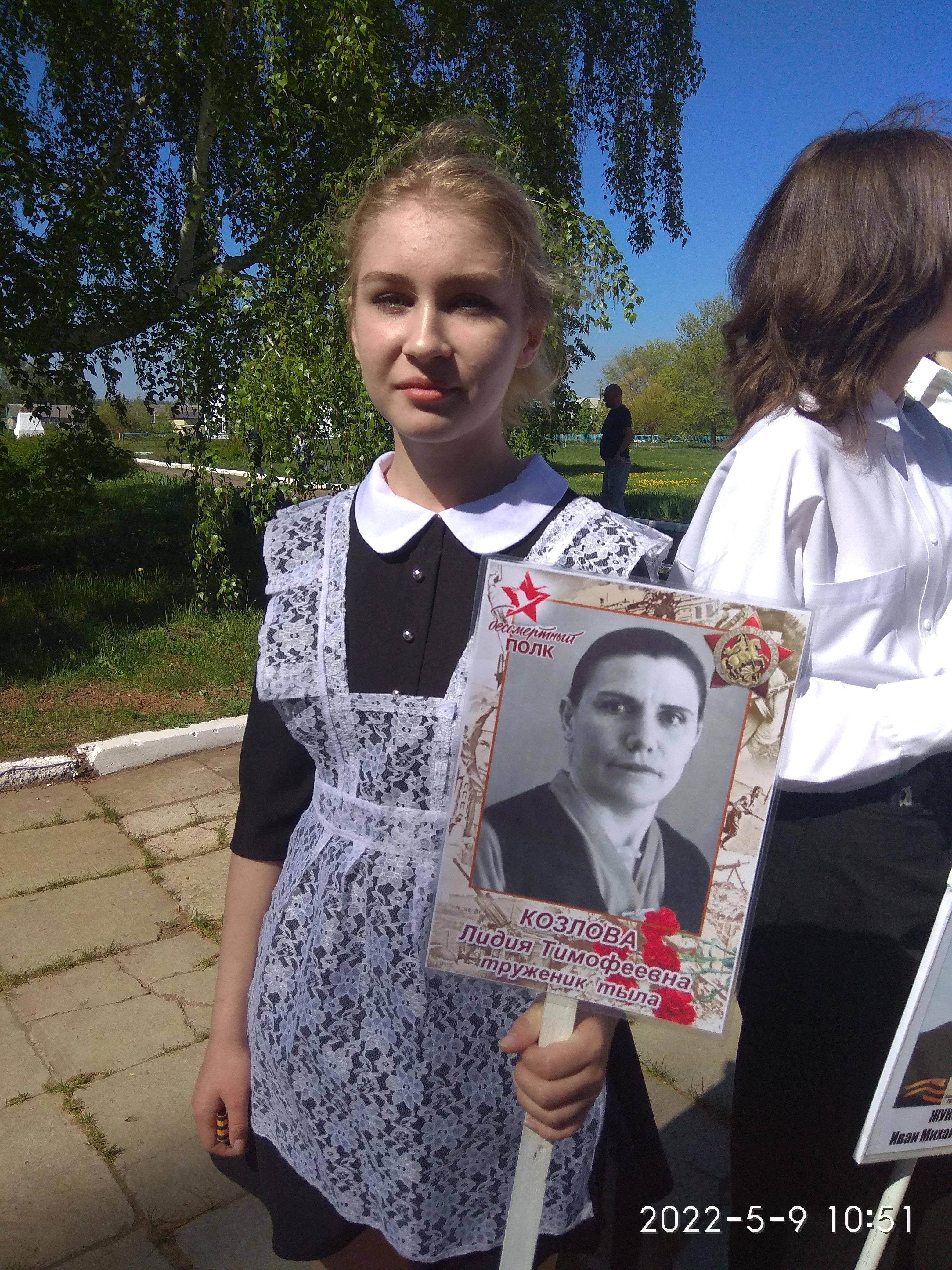 Мой ребенок шествововал с портретом двоюродной прабабушки, в доме которой сейчас мы живем. Она была труженицей тыла, так как во время войны ей было уже четырнадцать лет (ровесница моей дочки). Потому, считая себя взрослой, наша бабуля помогала солдатам, возила горючее на подводе из тыла к линии фронта в то время, как младшие сестры собирали колоски на полях, мерзлую картошку, грибы, чтобы пережить военный голод. А когда она была старенькой, к ней не раз приходили ребята из школы, записывали ее воспоминания о войне...
