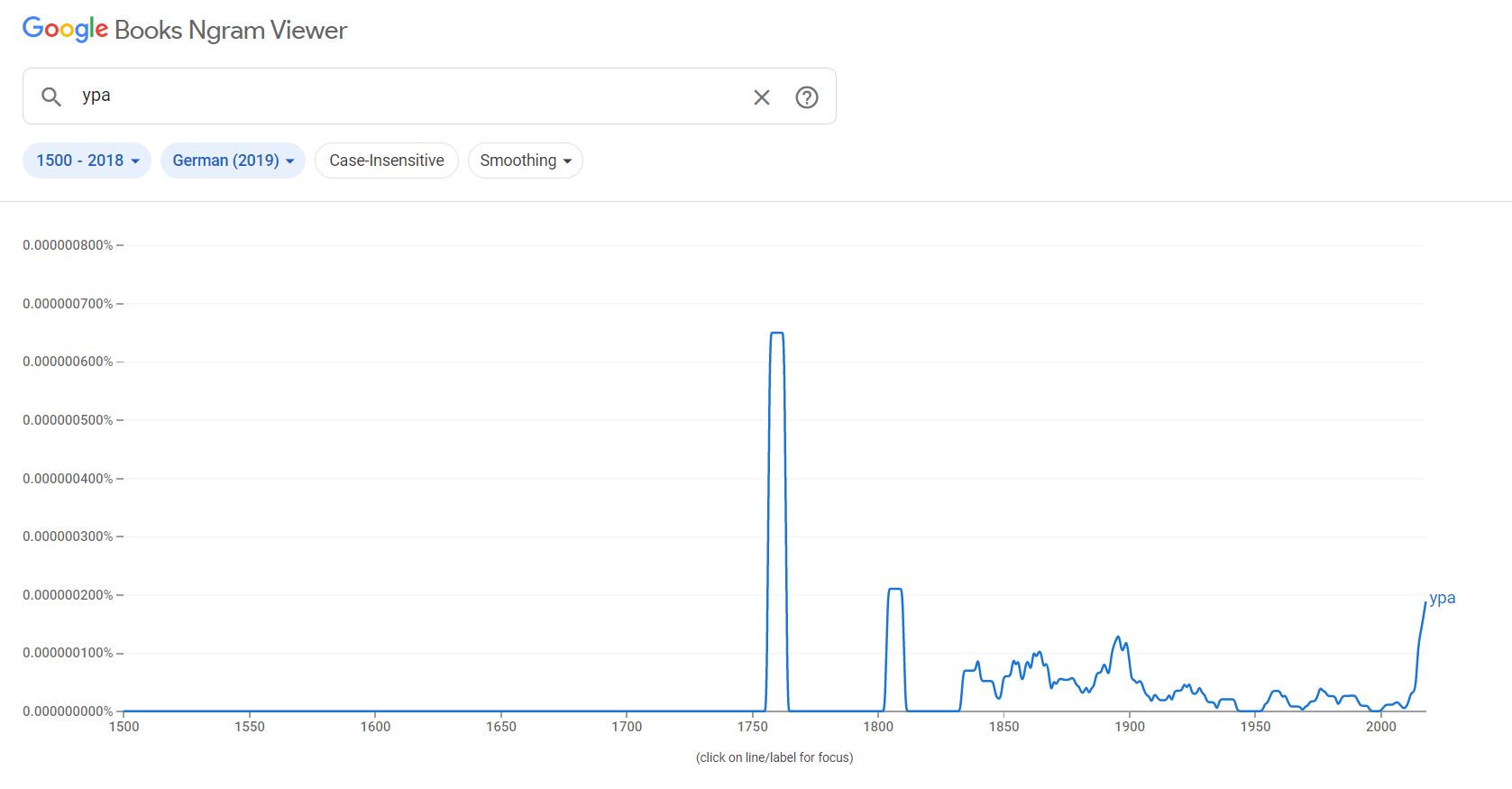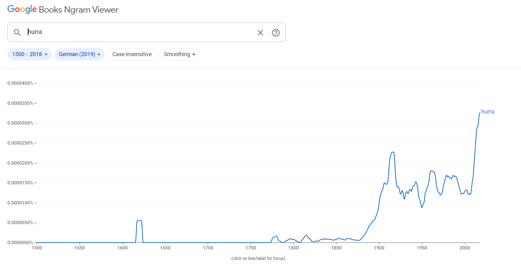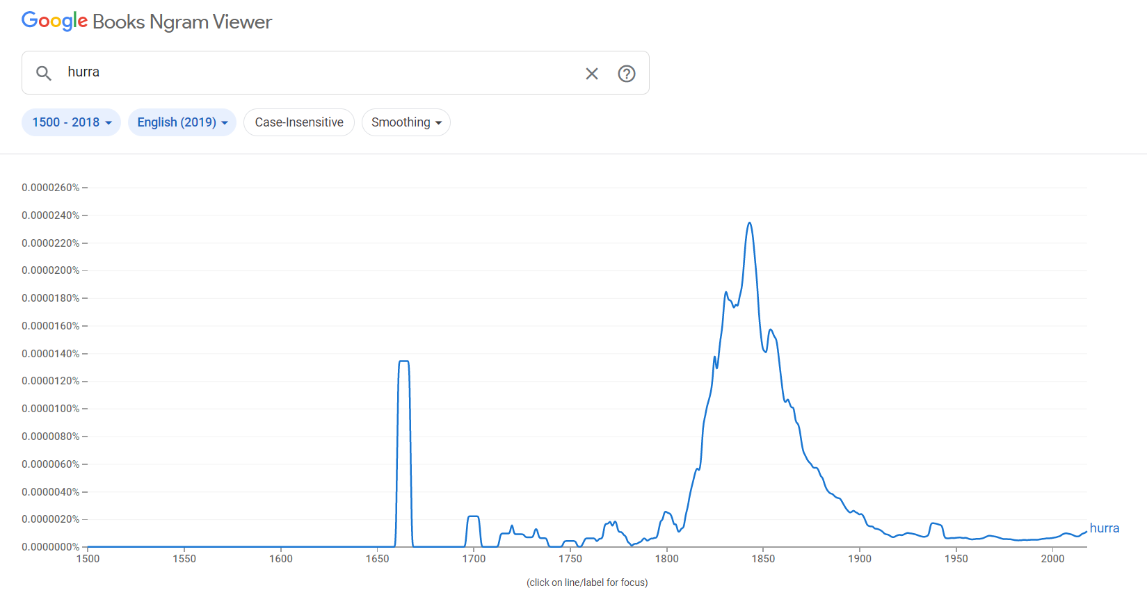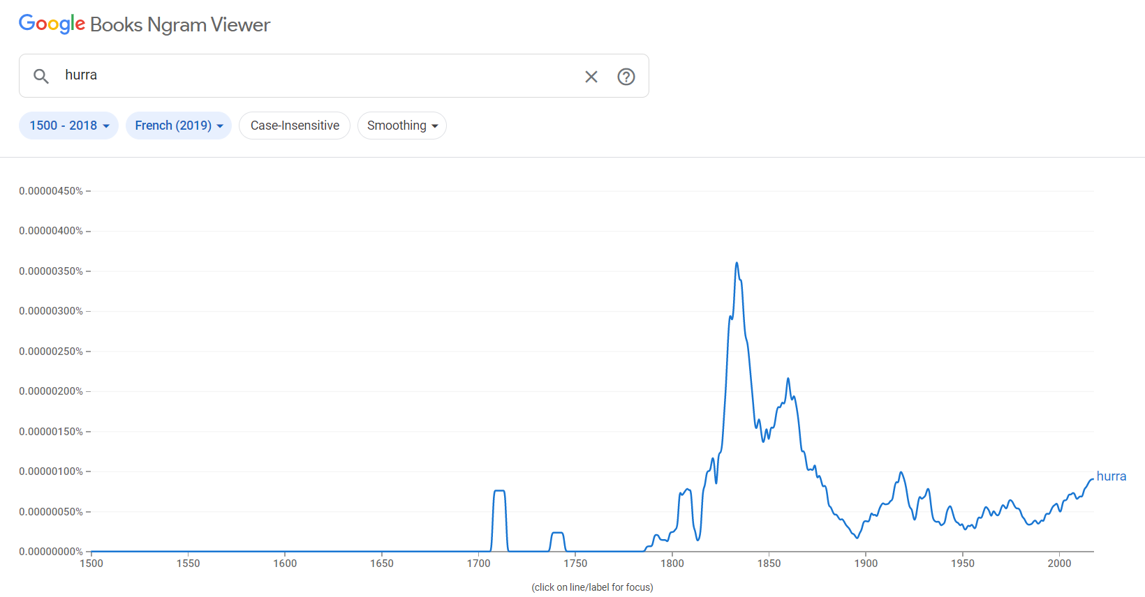 Что же касается фиксации этого слова в официальных документах, то оно однозначно упоминается в отчёте о сражении при Гросс-Егерсдорфе, которое произошло 19 августа 1757 года. Можно предположить, что наши солдаты позаимствовали его у немцев, но если посмотреть данные в том же Google, то получится такая диаграмма для "hurra":