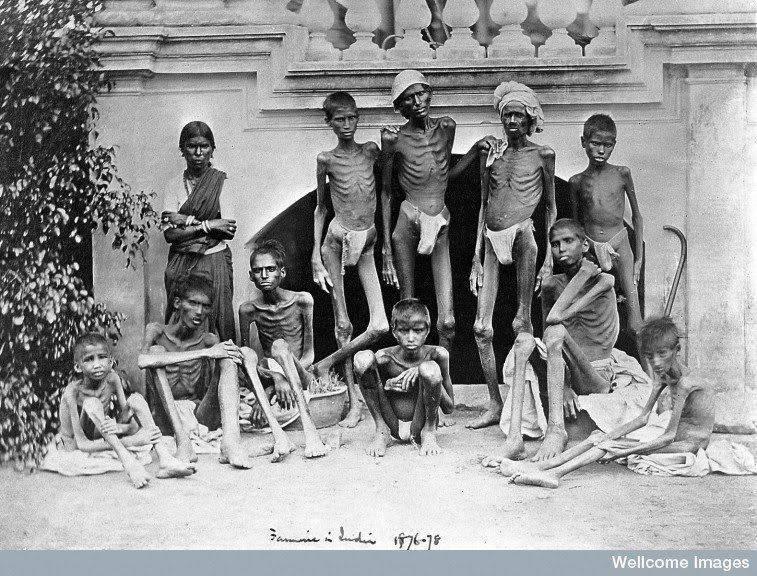 Англичане пришли туда в 18 веке, в лице бандитской британской Ост-Индской компании, чьи кровавые деяния неисчислимы, но мы коснемся только их действий в Бенгалии. В результате битвы при Плесси индийское навабство Бенгалия перешло во владения вышеуказанной ОПГ - британской Ост-Индийской компании. Эти бандиты, разграбили всю казну Бенгалии, резко повысили налоги (в разы), местным торговцам запретили заниматься торговлей, были введены внутренние таможни, сотни тысяч ремесленников были переведены в статус рабов, им запрещалось сдавать товары любым лицам, кроме компании, а они их принимали по ценам чуть выше себестоимости, в итоге все население загнали на грань нищеты. Аналогичный трюк был проведен и с крестьянами. В итоге первые же низкоурожайные годы привели к массовому голоду, во время которого по британским источникам умерло в районе 10 миллионов человек в 1769-1773 годах, а мы знаем, как считали просвещённые джентльмены, поэтому прикиньте реальные масштабы бедствия. Причем компания не принимала никаких мер, по спасению ограбленных ими людей.