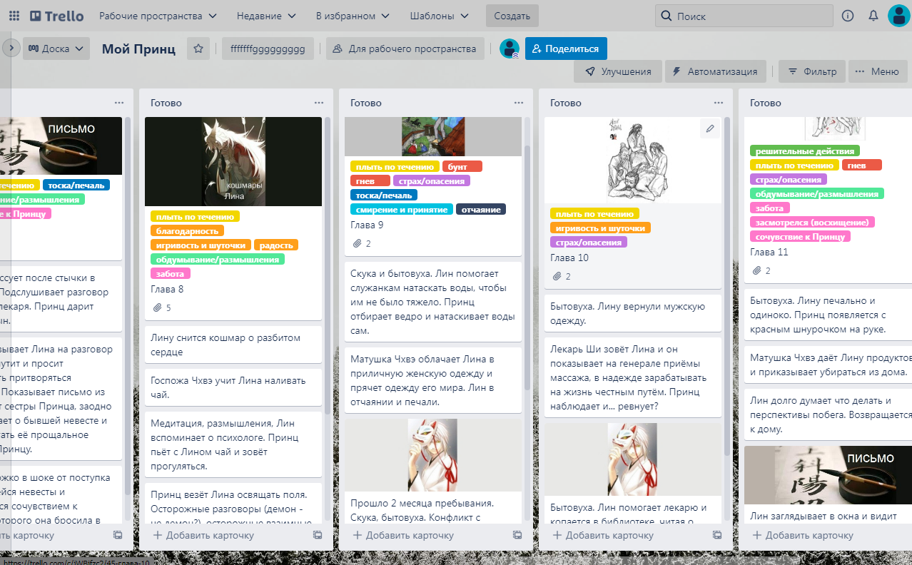 Короче, взяла я свою историю про попаданца, которого приняли за Кумихо, и попробовала разложить главы и сцены по той же схеме, только добавила картиночек и метки не "готово" и "доработать", а по состоянию и настроению героя.