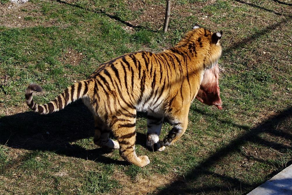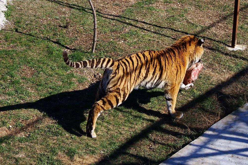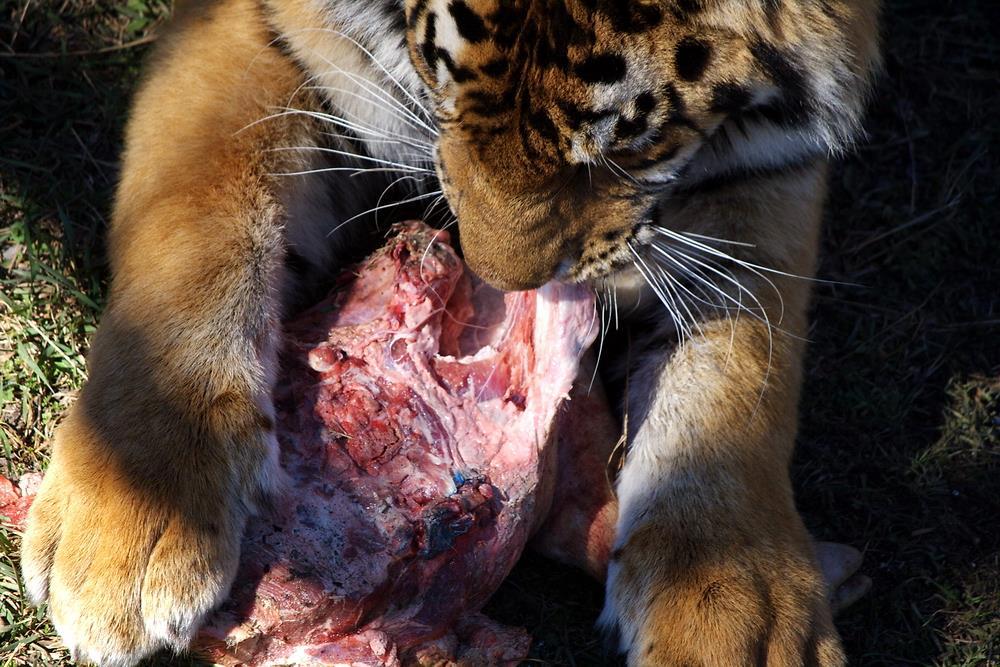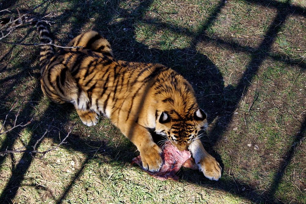 "Зацепишь вилкой мясо и просовываешь узким концом (обычно – костью) вперед между прутьями. Джам, как истый джентльмен, огрызался на свою супругу и отталкивал ее, если она пыталась опередить его. Схватит мясо зубами, упрется в каменную кладку и тянет, выгнув спину и напрягая все мускулы. Невероятная и даже грозная демонстрация силы: сантиметр за сантиметром тигр протаскивал мясо между прутьями, заставляя их отгибаться в стороны! Но вот прутья вдруг отпускают хватку, тигр от неожиданности садится и тут же, высоко подняв голову, важно шагает через кусты к пруду, чтобы там сожрать добычу."