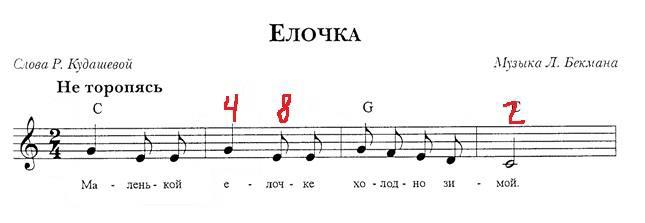 Но вернемся к «Елочке». Вот так выглядит простая нотная запись. Здесь нет аккордов, что облегчает нашу жизнь. По сути, это запись для вокала.