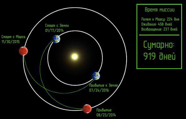Сейчас рассмотрим беспощадную математику на примере корабля для полета к Марсу и обратно. Для полета к иным телам Солнечной системы используют так называемые гомановские траектории. Это самые экономичные в плане топлива траектории. Ниже приведен пример полета к Марсу, если бы он состоялся в 2014 году.