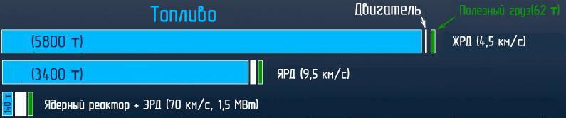 Как видим, мягко говоря, это не фантастика. Да можно сократить миссию до 545 дней если совершить гравитационный маневр у Венеры, но для космических боев этого скажем маловато))). И еще более удручающей картиной выглядит соотношение массы полезной нагрузки, топлива и типа применяемого двигателя для этой миссии.