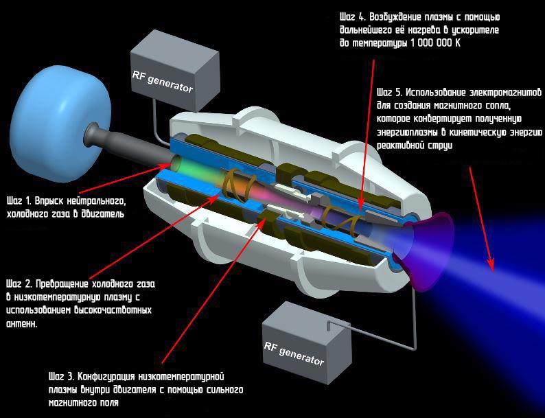 Но нам же нужны космические баталии из фантастических книг и фильмов, поэтому гомановские траектории не подходят, а подходят гиперболические траектории. Такие траектории в нашей Солнечной системе начинаются с приращенной скорости в 16,65 км/с. С учетом того, что наша Земля имеет орбитальную скорость 29,78 км/с, а Марс 24,13 км/с, то начальная и конечная скорости должны соответствовать скоростям планет «отправления» и «назначения». Т.е. нашему кораблю нужно прирастить скорость на 16,65 км/с, — она станет равной 46,43 км/с, а потом сбросить лишние 22,3 км/с, что в целом выводит нас на дельту скорости в 39 км/с. Ни один ЖРД или ЯРД на такое не способен. Поэтому я возвращаюсь к уже упомянутому VASIMR. Ниже его принцип работы.
