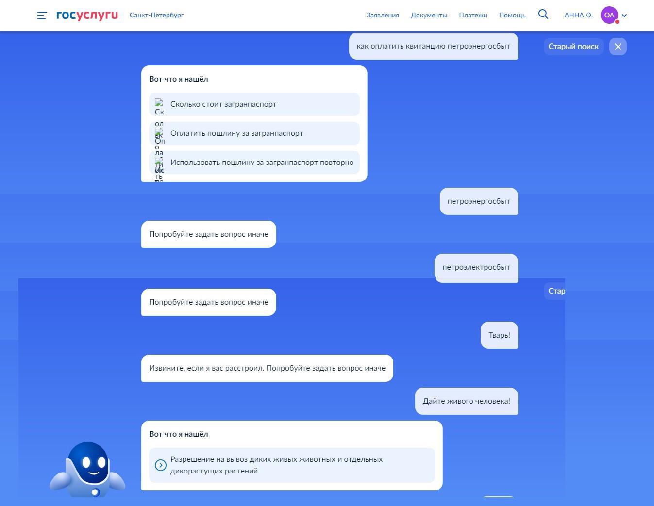 Автор: Анна ОвчинниковаПришла квитанция на квартплату. Хрен уже с ним, что нас всю весну коммунальщики поджаривают, как черти в аду - грешников, и выставляют за эту пытку адскую же сумму. Но! Сайт петроэлектросбыта висит. Верней, даже лежит. Пытаюсь оплатить через госуслуги - и не нахожу там в списке нашего электросбыта. Лезу в чат за помощью, как всегда, выскакивает с предложениями помощи "умный" робот Макс. Чтобы его создатели сами им пользовались! Наш диалог привожу ниже: