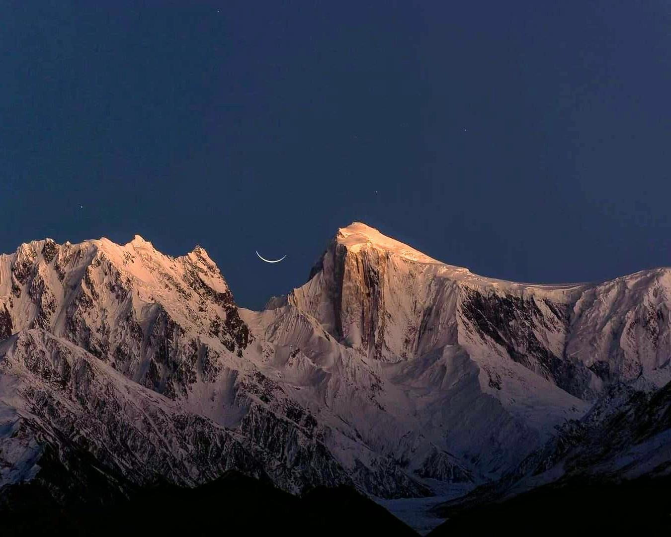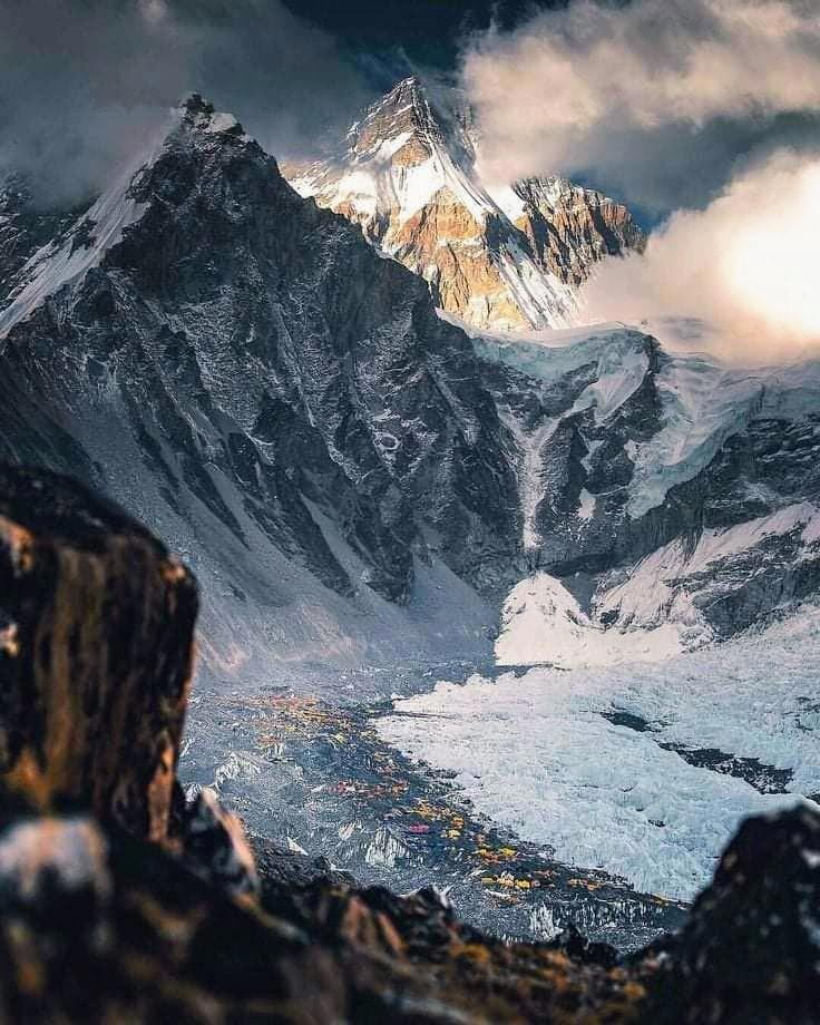 Чогори ближе к нам. Эверест дальше и освещен солнцем.