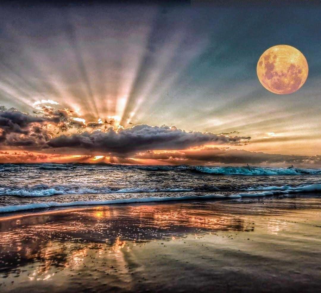 Полная луна и лучи солнца на одном снимке.