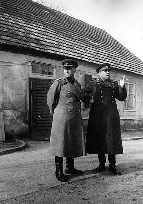 Через минут 30 смотрю, едет легковая машина, а за ней пикап с людьми, с кино- и фотоаппаратами. Я остановил их метрах в 30 от дома. Поздоровались с Еременко, и тут же я махнул рукой пикапу, чтобы уезжал обратно. Еременко стал просить оставить эту «кинобригаду» для того, чтобы сфотографироваться со Сталиным «в фронтовых условиях». Я сказал: пока убери, а когда договоришься с т. Сталиным, тогда позовем.