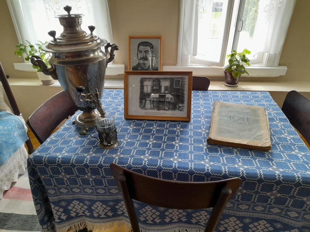 ХОзяйка - Н. Кондратьева поделилась харчами с соседями. Позже местное руководство переселило ее с дочкой в новый дом (хозяйка была мастером на заводе, ее ценили - дом к слову в котором Сталин останавливался - тоже предприятие помогло строить), а в старом решили создать музей. Когда Сталину об этом доложили - он пожал плечами и сказал, что музей ему живому делать странно, лучше пусть библиотеку откроют. Так что обошлись только мемориальной доской. Во время героической борьбы Хрущева с культом личности местные доску сняли и припрятали. Сейчас пригодилась.