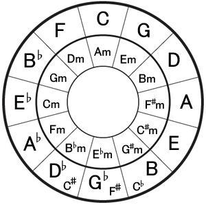 На внешнем круге выписываются мажорные тональности, на внутреннем - минорные. Они имеют соответствующее буквенное обозначение. Друг под другом находятся тональности, являющиеся параллельными.