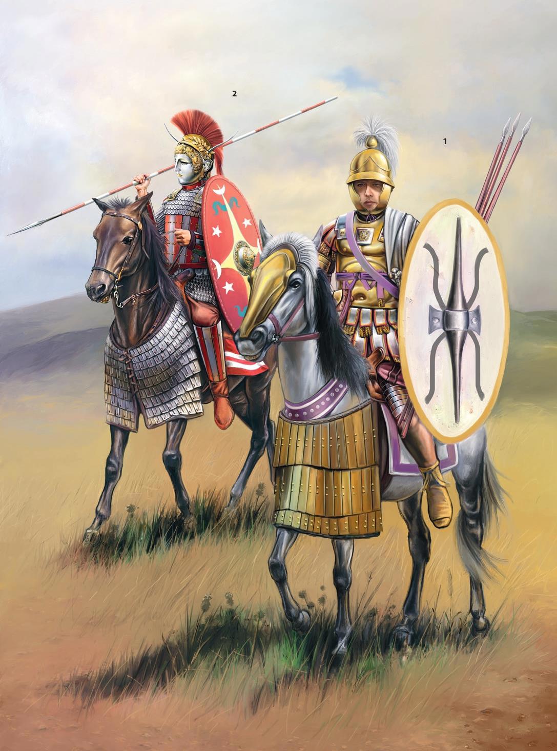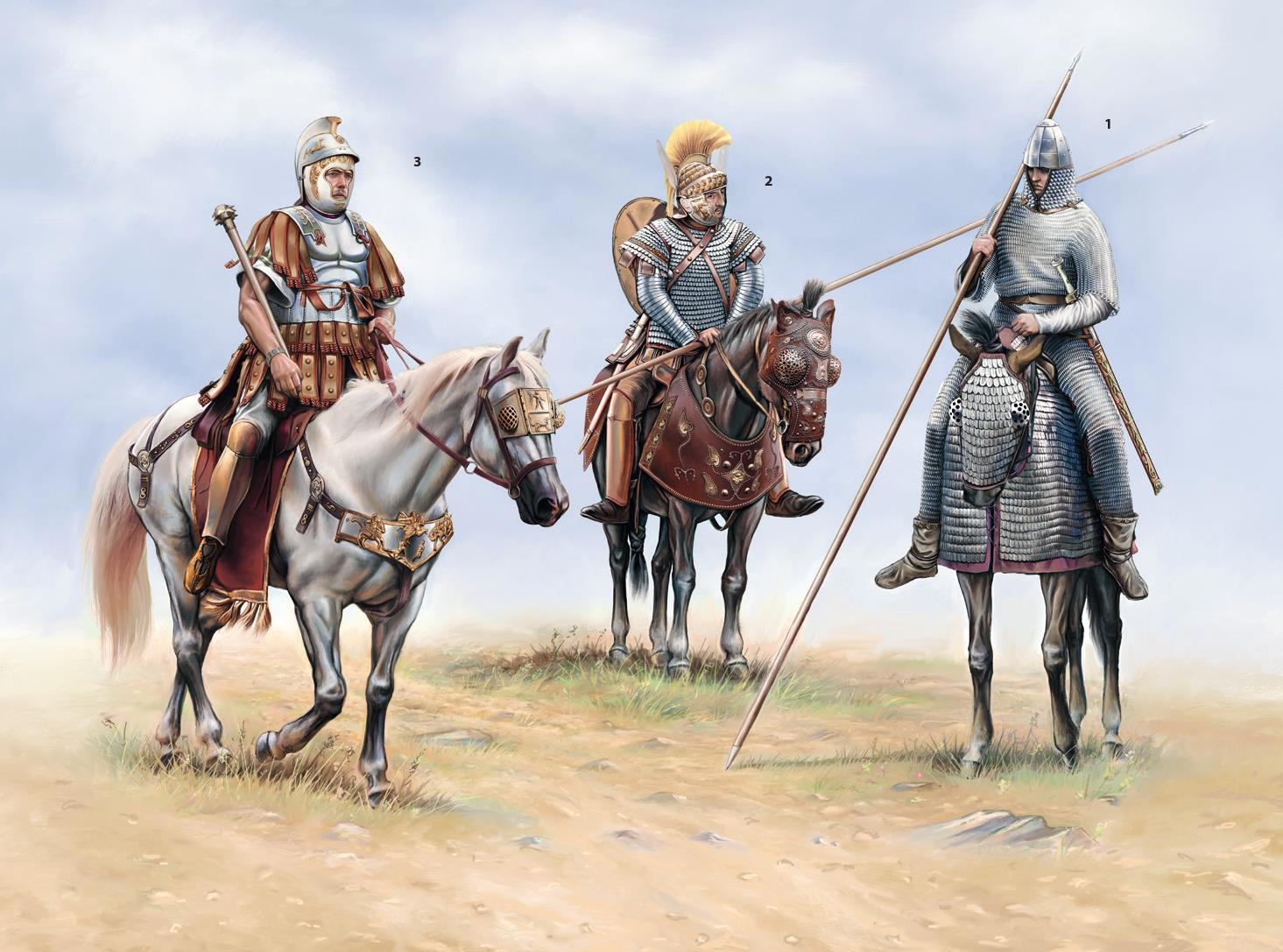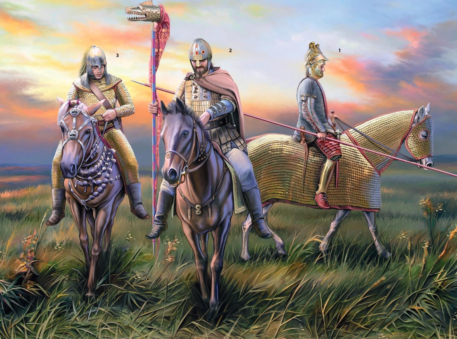 1. Римский clibanarius; Дура-Эвропос (256 г. н.э.). Реконструирован на основе находок в Дура-Эвропос. Чешуйчатый доспех лошади, выполненный из железа и бронзы, как можно заметить, практически полностью покрывает лошадь. На всаднике также можно заметить открытый шлем Франкфурт-Хеддернхеймского типа - между прочим, реконструирован по фрагментам из Дура-Эвропос. По всей видимости, шлем, фрагменты которого были обнаружены, представлял собой весьма редкий вариант с сдвоенной протомой* (double protomes) в форме орла (подобный ему шлем представлен в коллекции всё того же Акселя Гуттмана, а также подобное изображение было найдено на нескольких римских монетах). Кроме этого, на нём также можно заметить весьма интересную кольчужную рубаху - особенно внимательные зрители отчётливо увидят, что последние ряды колец нижнего края рубахи и её рукавов сделаны из бронзы. К слову, благодаря этому становится отчётливо виден переход между краем кольчужной рубахи и галерусом, состоящим из уложенных внахлёст пластинок* (laminated iron plates). Кроме того, на всаднике при должной внимательности можно заметить балтеус - перевязь для меча (следует полагать, что и сам меч, представленный, кавалерийской спатой, тоже был, ибо иначе в этой перевязи просто не было бы необходимости). Также, у нижнего края рубахи можно заметить булаву - по всей видимости, предназначенная для ближнего боя при контакте с противником вплотную. Кроме этого, на бедре всадника можно заметить набедренники из лакированной кожи, так называемые παραμηρίδιος (переводится буквально как "набедренники"). К слову, они были воссозданы на основании археологической находки, обнаруженной во всё той же Дура-Эвропос. Продолжая тему, необходимо отметить, что крепились они к бедру, по всей видимости, при помощи специальных шнурков, простираясь от талии до колена, где защита ноги продолжалась уже при помощи бронзовых поножей. Наконец, основным оружием всадника выступает контос. Кроме того, по всей видимости, у всадника должен быть щит, но здесь он не представлен* (this time carried without a shield)