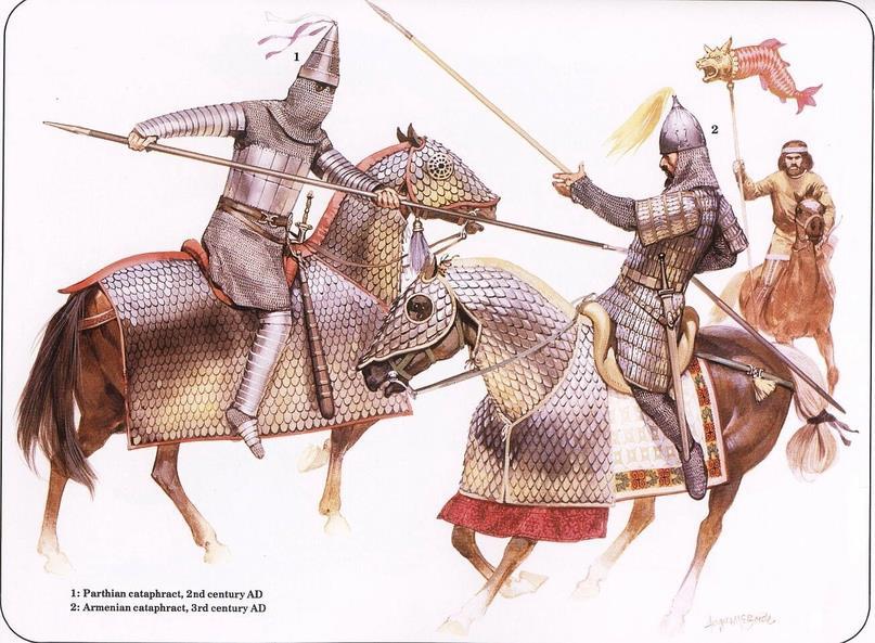 К слову, заметили прообраз римского драконария (он же векзилифер) на фоне? Или неужели вы думали, что римляне сами придумали подобную приблуду? Кстати, не совсем уверен по поводу чешуйчатой попоны у всадника №2 - она так резко обрывается. Очень странно - вероятно, изображение не совсем достоверное. Впрочем, как-то пофиг - мне нужно было только наглядно показать, как выглядел этот полутаран (к слову, именно он, в ходе своей эволюции, постепенно превратится в полноценный таран; скорее всего, к тому моменту уже существовал достаточный практический и теоретический опыт для осуществления подобного приёма, но недостаточный уровень развития лук седла и подпруги делал осуществление рыцарского тарана просто бессмысленным - имея седло вроде того, что показано выше у парфянского всадника, всадник, даже успешно осуществив подобный приём, немедленно бы ощутил себя наказанным - отдача от подобного удара немедленно заставила бы его прокатиться по спине лошади, что, очевидно, не очень то и приятно и удобно).