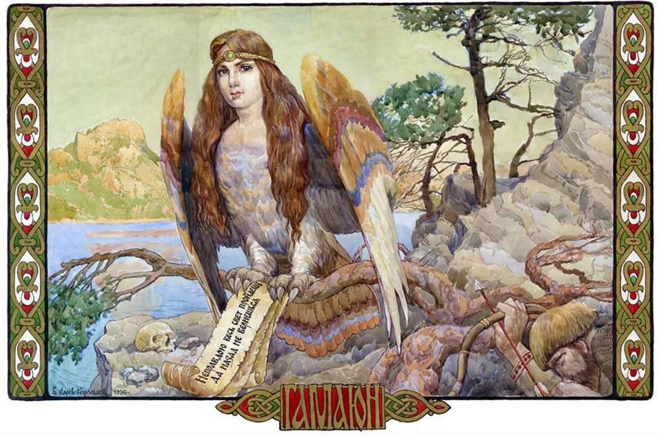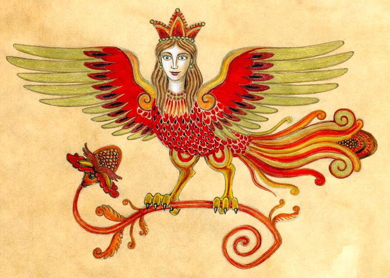 Тут даже не птица, а голова с человеческим вполне лицом, но и с крыльями. То есть какой-то весьма сложносочинённый образ. Вспоминаются такие родные Матерь Сва, Сирин, Гамаюн.