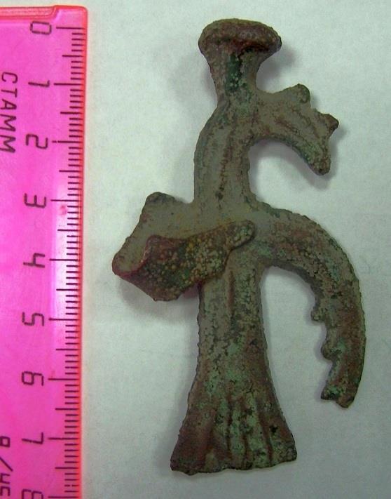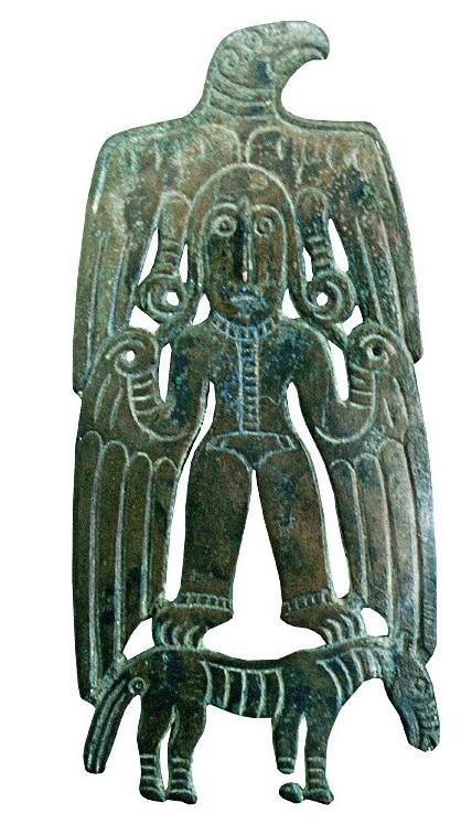 Но образ пернатых имел не только такой вид. Да и прототипы образов имели разное происхождение. Иногда, как в случае этой находки, они вообще никак не были связаны с конкретным видом птиц. То есть с пернатыми их роднят только крылья, но позже было и по-другому. Вот ещё одна уральская находка размером меньше ладони, относящаяся к более позднему времени, и в ней безошибочно читается сокол: